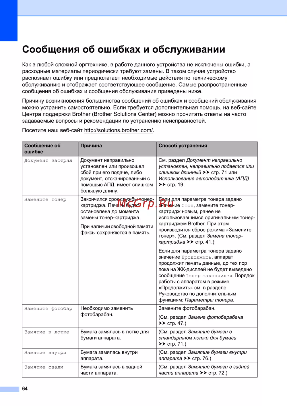 - Если требуется дополнительная помощь на веб сайте центра поддержки brother brother solutions center можно прочитать ответы на часто задаваемые вопросы и рекомендации по устранению неисправностей посетите наш веб сайт http solutions brother com p.88