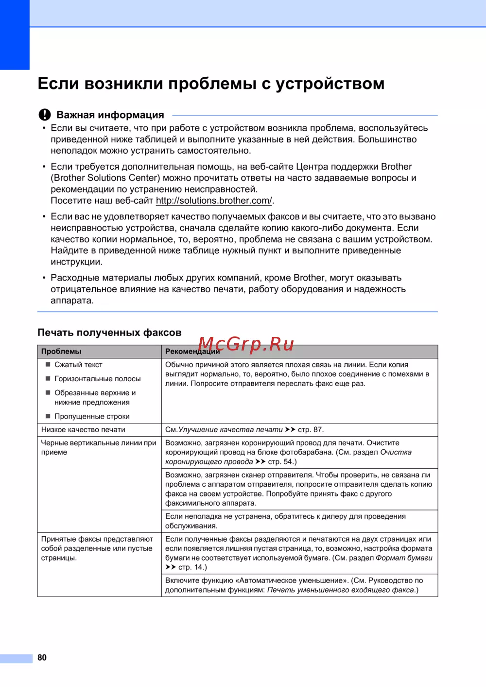 - Если требуется дополнительная помощь на веб сайте центра поддержки brother brother solutions center можно прочитать ответы на часто задаваемые вопросы и рекомендации по устранению неисправностей посетите наш веб сайт http solutions brother com p.88
