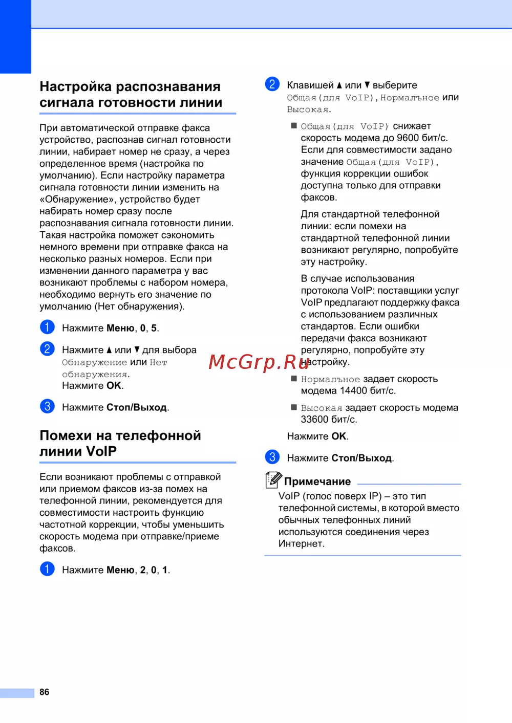 Узнайте, как настроить распознавание сигнала готовности линии для автоматической отправки факсов и устранить помехи на телефонной линии VoIP.
