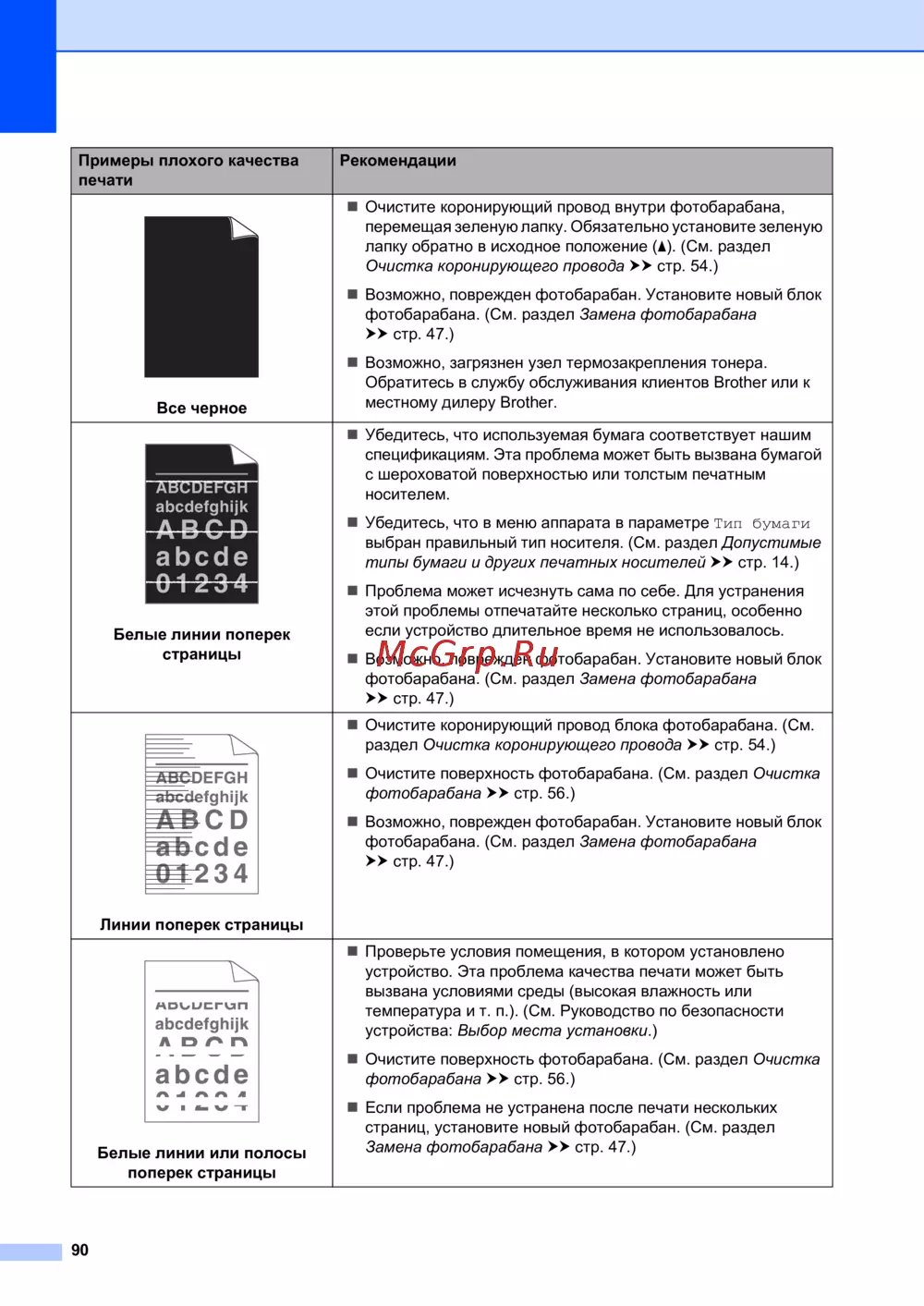Узнайте, как устранить проблемы с качеством печати, включая белые линии и полосы. Следуйте рекомендациям по очистке и замене фотобарабана для улучшения печати.