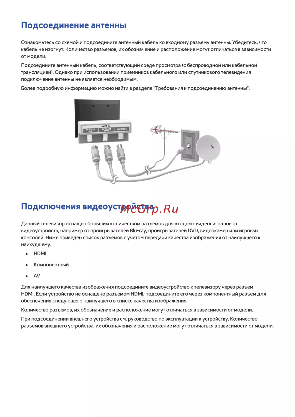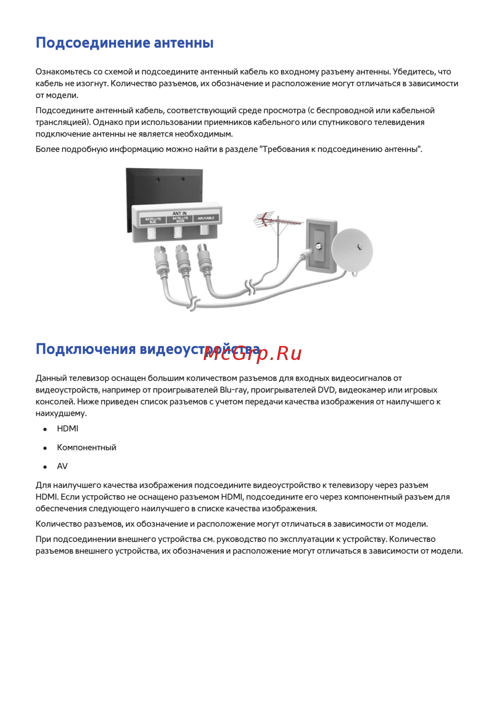 - Подключение к эфирному кабельному спутниковому источнику сигнала p.194