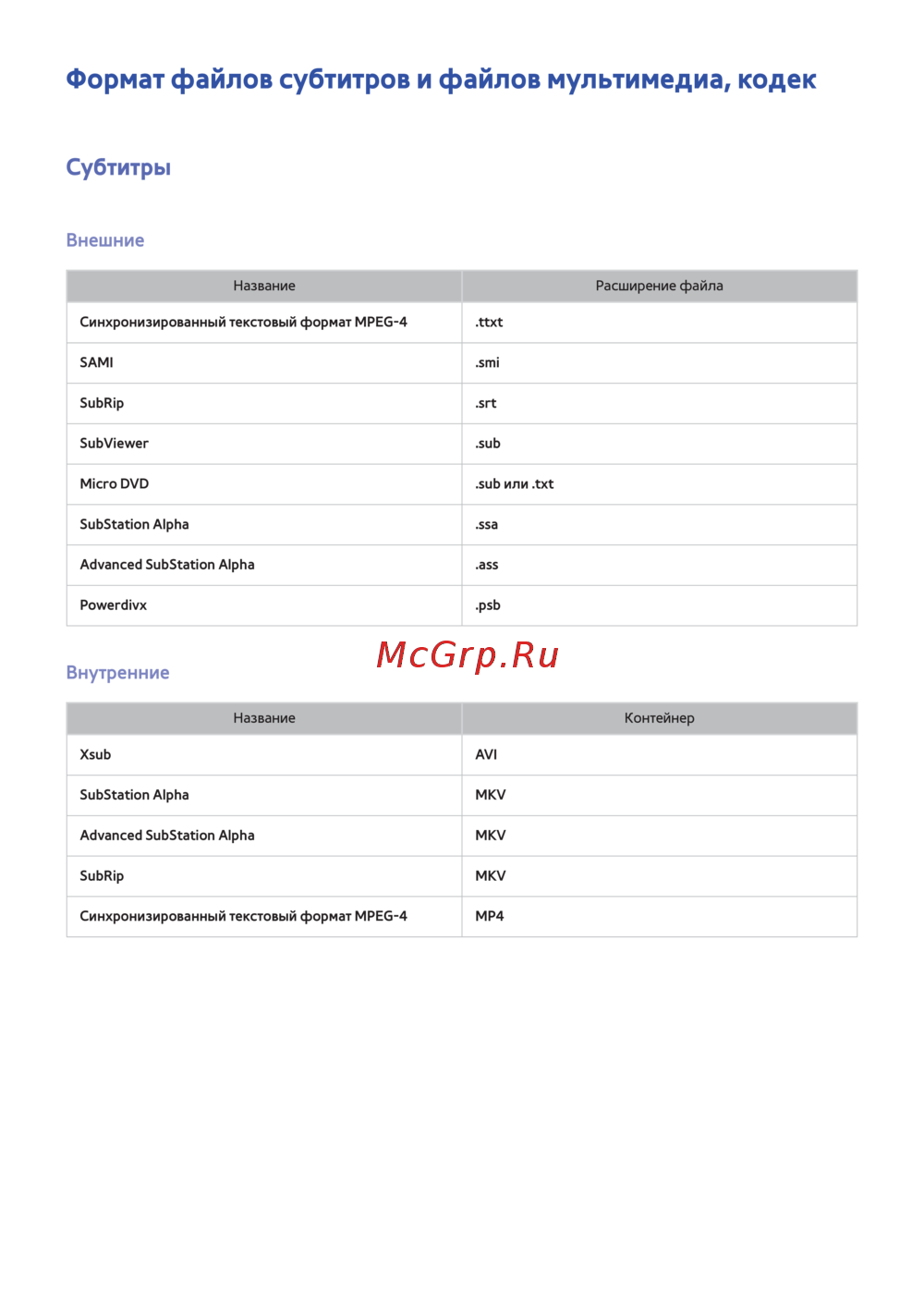 - Формат файлов субтитров и файлов мультимедиа кодек p.179