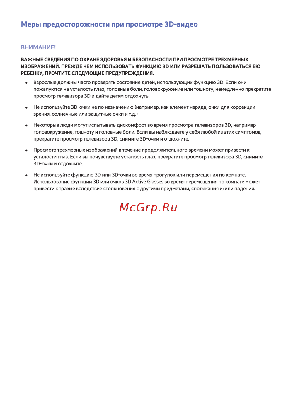 усталости глаз. Если вы почувствуете усталость глаз, прекратите просмотр телевизора 3D, снимите
