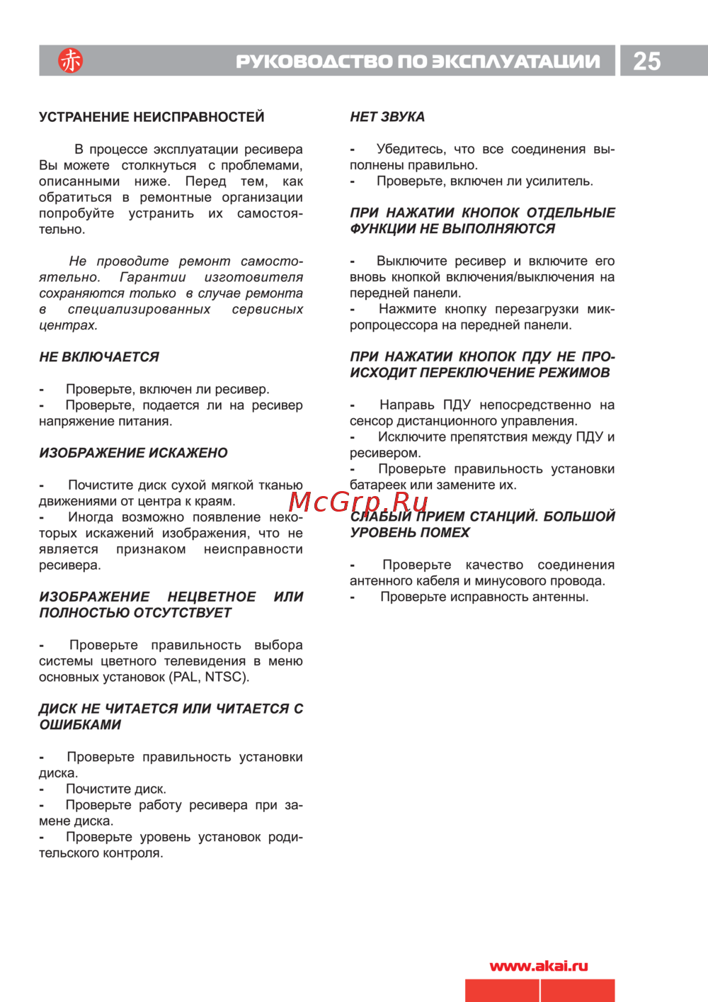 РУКОВОДСТВО ПО ЭКСПЛУАТАЦИИ I 25 УСТРАНЕНИЕ НЕИСПРАВНОСТЕЙ НЕТ ЗВУКА В процессе эксплуатации ресивера Вы можете столкнуться с проблемами описанными ниже Перед тем как обратиться в ремонтные организации попробуйте устранить их самостоя тельно Убедитесь что все соединения вы полнены правильно Проверьте включен ли усилитель ПРИ НАЖАТИИ КНОПОК ОТДЕЛЬНЫЕ ФУНКЦИИ НЕ ВЫПОЛНЯЮТСЯ Не проводите ремонт самосто ятельно Гарантии изготовителя сохраняются только в случае ремонта в специализированных сервисных центрах Выключите ресивер и включите его вновь кнопкой включения выключения на передней панели Нажмите кнопку перезагрузки мик ропроцессора на передней панели НЕ ВКЛЮЧАЕТСЯ ПРИ НАЖАТИИ КНОПОК ПДУ НЕ ПРО ИСХОДИТ ПЕРЕКЛЮЧЕНИЕ РЕЖИМОВ Проверьте включен ли ресивер Проверьте подается ли на ресивер напряжение питания ИЗОБРАЖЕНИЕ ИСКАЖЕНО Почистите диск сухой мягкой тканью движениями от центра к краям Иногда возможно появление неко торых искажений изображения что не является признаком неисправности ресивера ИЗОБРАЖЕНИЕ НЕЦВЕТНОЕ ПОЛНОСТЬЮ ОТСУТСТВУЕТ ИЛИ Направь ПДУ непосредственно на сенсор дистанционного управления Исключите препятствия между ПДУ и ресивером Проверьте правильность установки батареек или замените их СЛАБЫЙ ПРИЕМ СТАНЦИЙ БОЛЬШОЙ УРОВЕНЬ ПОМЕХ Проверьте качество соединения антенного кабеля и минусового провода Проверьте исправность антенны Проверьте правильность выбора системы цветного телевидения в меню основных установок PAL NTSC ДИСК НЕ ЧИТАЕТСЯ ИЛИ ЧИТАЕТСЯ С ОШИБКАМИ Проверьте правильность установки диска Почистите диск Проверьте работу ресивера при за мене диска Проверьте уровень установок роди тельского контроля www akai ru