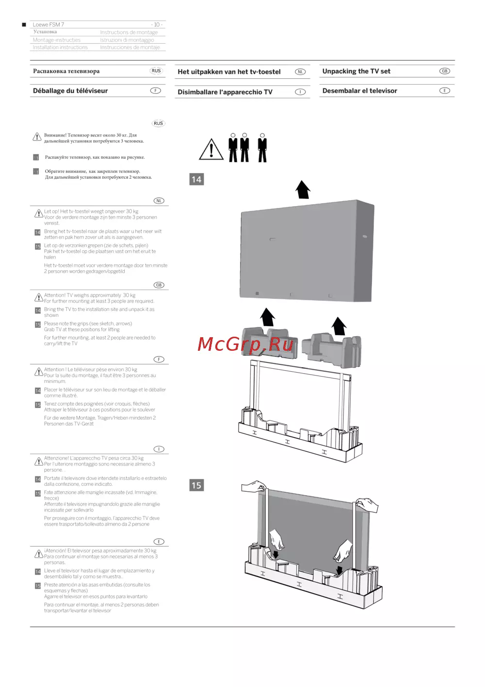 Узнайте, как правильно распаковать и установить телевизор весом около 30 кг. Следуйте инструкциям для безопасной установки с помощью нескольких человек.