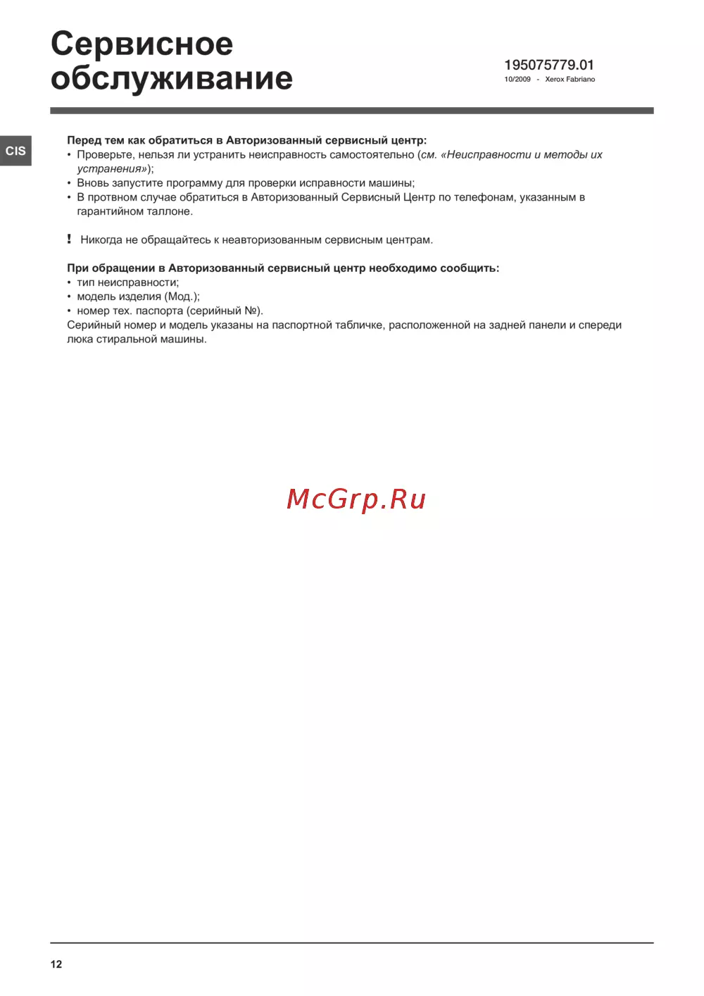 • В протвном случае обратиться в Авторизованный Сервисный Центр по телефонам, указанным в