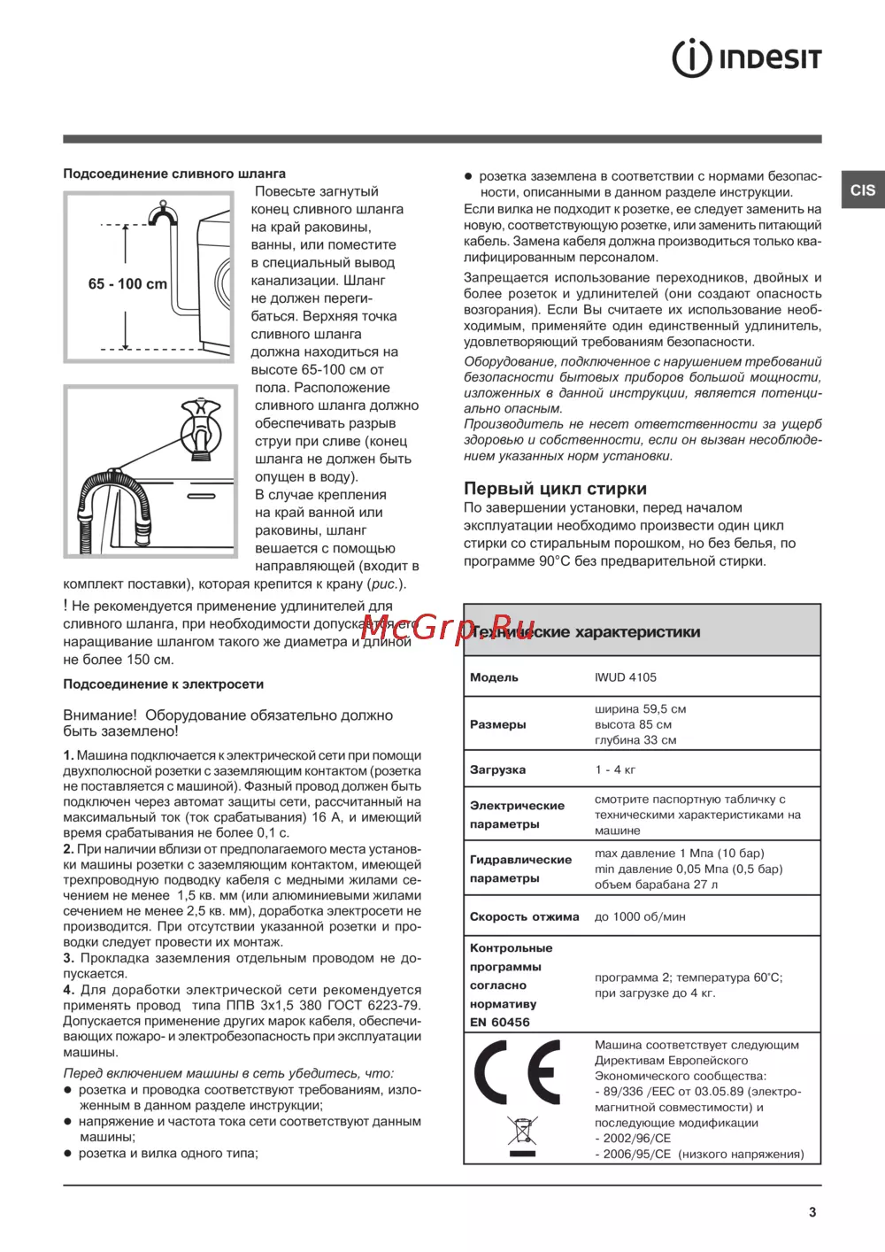 Indesit IWUD 4105 — правила подключения сливного шланга и электросети для оборудования [3/12]