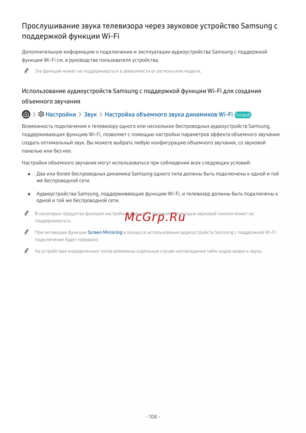" При активации функции Screen Mirroring в процессе использования аудиоустройств Samsung с поддержкой Wi-Fi
