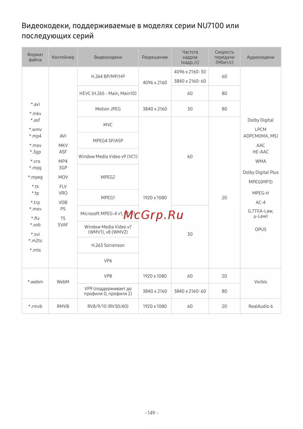Samsung UE65NU7470U [149/188] Видеокодеки поддерживаемые в моделях серии nu7100 или последующих серий