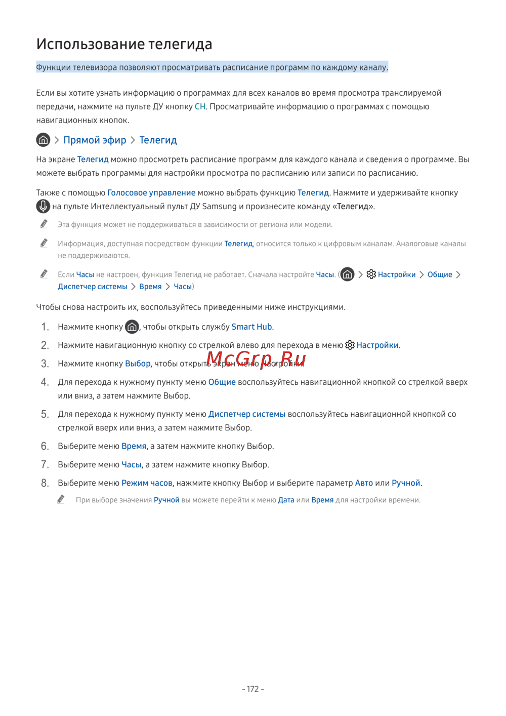 " Если Часы не настроен, функция Телегид не работает. Сначала настройте Часы. ( Настройки Общие
