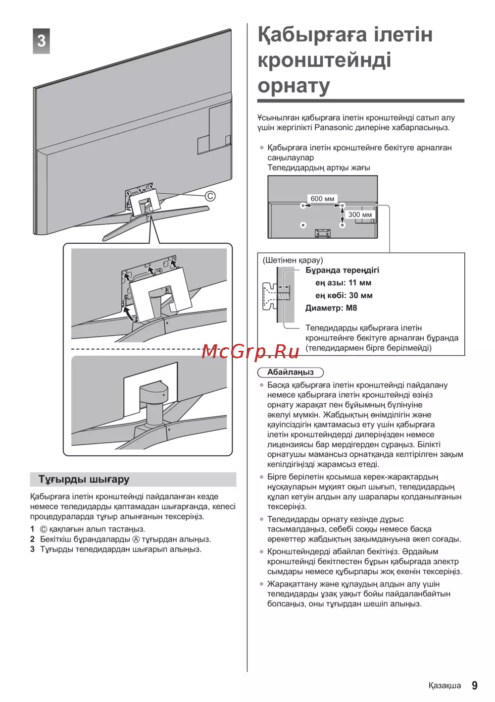 Кабыргага лепи кронштейнд орнату сыныпган кабыргага ineTiH кронштейнд сатып any уш н жерпдкл Panasonic диnepiне хабарпасыцыз Кабыргага ineTiH кронштейнге беютуге арнапган сацыпаупар Тепедидардын арткы жагы Шепнен карау Буранда терецд п ец азы 11 мм ец кебк 30 мм Диаметр М8 Тепедидарды кабыргага ineTiH кронштейнге беютуге арнапган буранда тепедидармен 6ipre бер пмейд Абайпацыз Баска кабыргага ineTiH кронштейнд пайдапану немесе кабыргага ineTiH кронштейнд езНз орнату жаракат пен буйымнын 6yniHyiHe aKenyi мумкН Жабдыктын ежмдin пн жэне Hayinci зд г н камтамасызету ушЫ кабыргага ineTiH кронштейндерд диперНзден немесе пицензиясы бар мерд герден сураныз BiniKTi орнатушы мамансыз орнатканда KenripinreH закым Keninflirini3fli жарамсыз етедк Тутырды шыгару Кабыргага ineTiH кронштейнд пайдапанган кезде немесе тепедидарды каптамадан шыгарганда Keneci процедурапарда тугыр апынганын тексерНз 1 какпагын апып тастаныз 2 Беютюш бурандапарды тугырдан апыцыз 3 Тугырды теледидардан шыгарып апыцыз Bipre 6epineriH косымша керек жарактарцын нускаупарын мукият окып шыгып тепедидардын купал KeryiH алдын any шарапары копданыпганын тексерНз Тепедидарды орнату кезЫде дурью тасымапдацыз ce6e6i соккы немесе баска эрекеттер жабдыктын закымдануына экел согады Кронштейндерд абайпап бектдз Эрцайым кронштейнд беютпестен бурын кабыргада эпектр сымдары немесе кубырпары жок екеын тексер н1з Жаракаттану жэне купаудын апдын any уш н тепедидарды узак уакыт бойы пайдапанбайтын бопсаныз оны тугырдан шеилп апыцыз Кдзакша 9