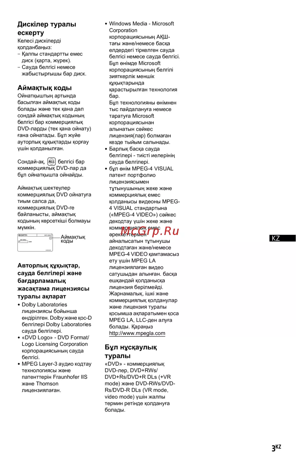 Дискілерді қолдану кезінде аймақтық кодтар мен авторлық құқықтар туралы маңызды ақпарат. Стандартты емес дискілерді пайдаланбау жөнінде ескертулер.