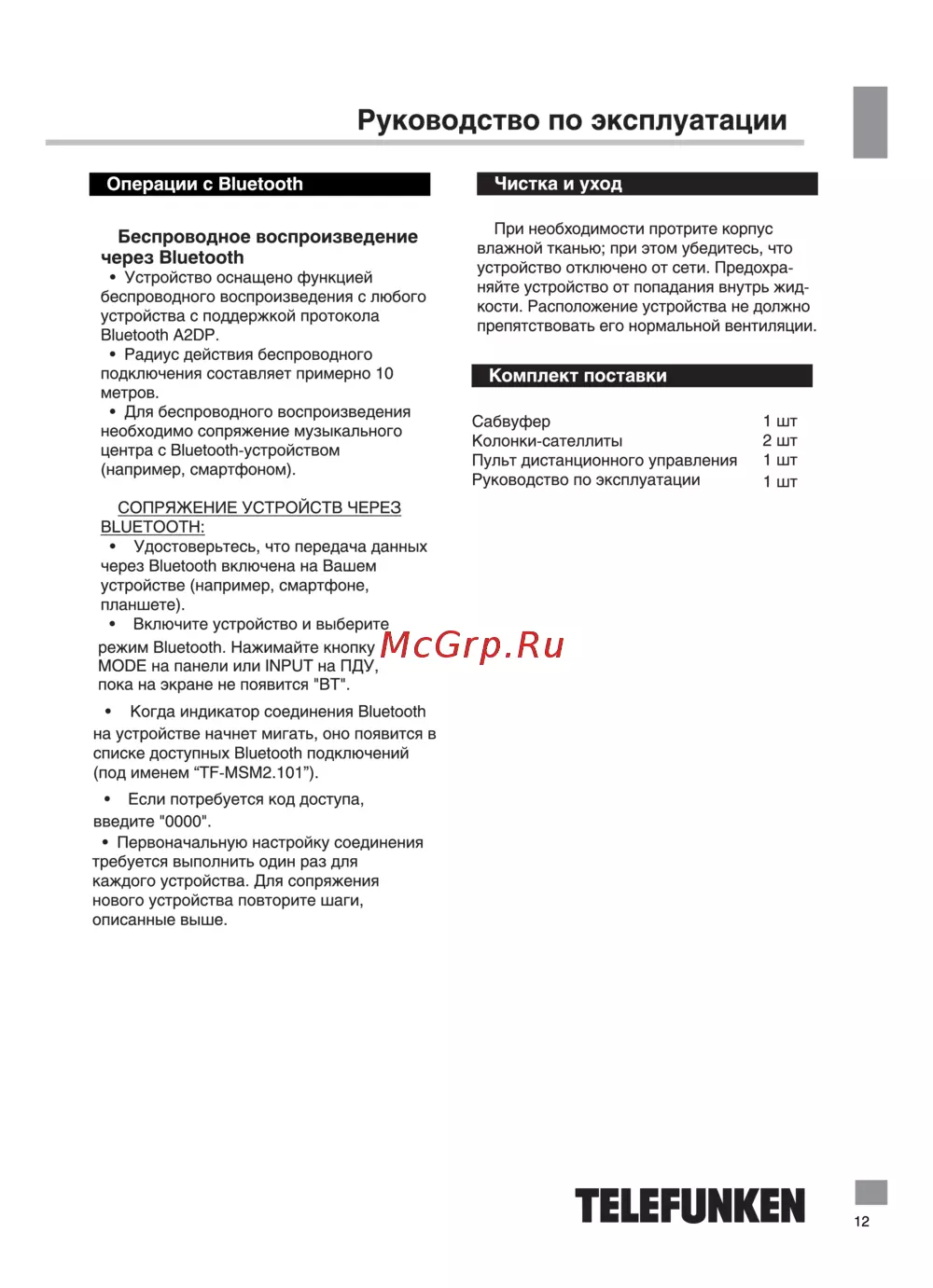 Руководство по эксплуатации Операции с Bluetooth Беспроводное воспроизведение через Bluetooth Устройство оснащено функцией беспроводного воспроизведения с любого устройства с поддержкой протокола Bluetooth A2DP Радиус действия беспроводного подключения составляет примерно 10 метров Для беспроводного воспроизведения необходимо сопряжение музыкального центра с Bluetooth устройством например смартфоном Чистка и уход При необходимости протрите корпус влажной тканью при этом убедитесь что устройство отключено от сети Предохра няйте устройство от попадания внутрь жид кости Расположение устройства не должно препятствовать его нормальной вентиляции Комплект поставки Сабвуфер 1шт Колонки сателлиты 2шт Пульт дистанционного управления 1 шт Руководство по эксплуатации 1шт СОПРЯЖЕНИЕ УСТРОЙСТВ ЧЕРЕЗ BLUETOOTH Удостоверьтесь что передача данных через Bluetooth включена на Вашем устройстве например смартфоне планшете Включите устройство и выберите режим Bluetooth Нажимайте кнопку MODE на панели или INPUT на ПДУ пока на экране не появится ВТ Когда индикатор соединения Bluetooth на устройстве начнет мигать оно появится в списке доступных Bluetooth подключений под именем TF MSM2 101 Если потребуется код доступа введите 0000 Первоначальную настройку соединения требуется выполнить один раз для каждого устройства Для сопряжения нового устройства повторите шаги описанные выше TELEFUNKEN 12