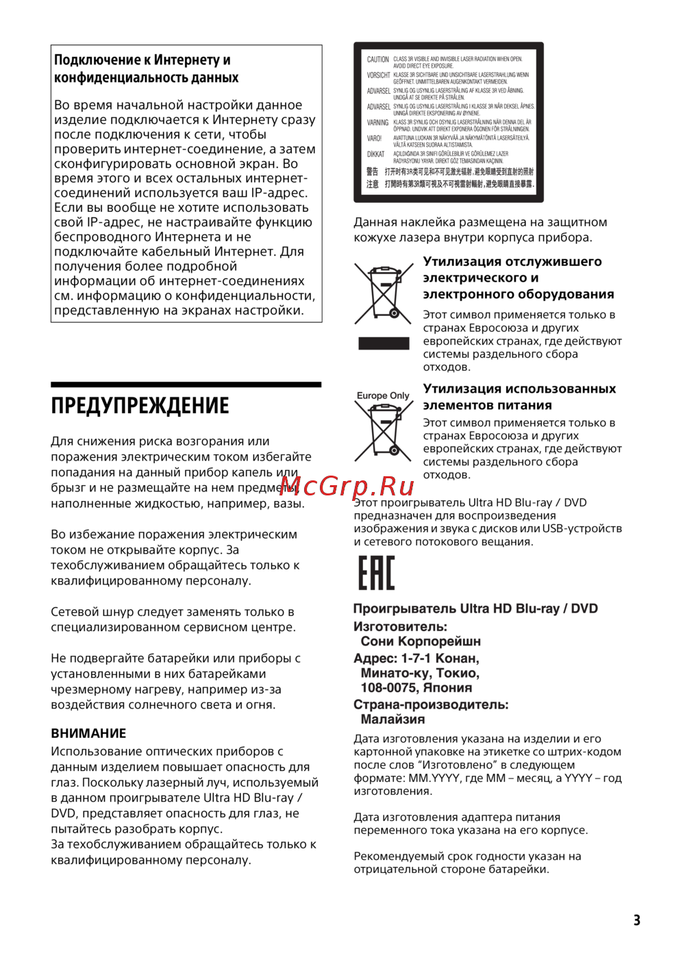 Sony UBP-X700 — предупреждения и рекомендации по безопасному использованию прибора [3/40]
