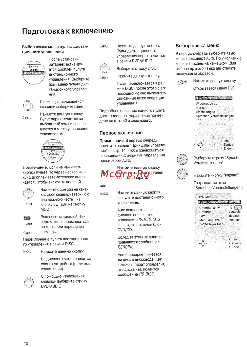 Подготовка к включению Выбор языка меню пульта дистан ционного управления После установки батареек активиру ется дисплей пульта дистанционного управления Выберите язык меню пульта дис танционного управле ния ЁТ Нажмите данную кнопку Пульт дистанционного управления переключается в режим DVD AUDIO V Нажмите данную кнопку Пульт переключается в ре жим DISC после этого с его помощью можно выполнять описанные ниже операции управления С помощью качающейся клавиши выберите язык Нажмите данную кнопку Пульт переключается на выбранный язык и возвра щается в меню управления телевизором Выберите строку DISC Выбор языка меню В первую очередь выберите язык меню пресивера Айго По умолчанию меню написаны на немецком Для выбора другого языка действуйте следующим образом Нажмите данную кнопку Открывается меню DVD Wiedergabe ab Marken Подробное описание данного пульта дистанционного управления приве дено на стр 42 и следующих Sprachen Voreinstellungen Ton Первое включение Примечание В первую очередь прочтите раздел Принципы управле ния на стр 14 чтобы ознакомиться с основными функциями управления пресивером Auro Примечание Если не нажимать кнопки пульта то через несколько се кунд дисплей автоматически выклю чается Чтобы включить дисплей или MÖD ИЛИ CSËFJ Нажмите один раз на кача ющуюся клавишу верхнюю или нижнюю часть на кнопку SET или на кнопку MOD Включается дисплей Те перь можно перемещаться по меню или передавать команды Переключение пульта дистанционно го управления в режим DiSC MOD Нажмите данную кнопку На дисплее пульта появится список устройств режимов управления С помощью качающейся клавиши выберите строку DVD AUDIO 10 Einstellungen Нажмите данную кнопку выключателя на передней панели аппарата V Info Q i v Zurück X v v Ende Выберите строку Sprachen Voreinstellungen Нажмите кнопку вправо Открывается окно Sprachen Voreinstellungen или ов Нажмите данную кнопку на пульте дистанционного управления Auro включается на дисплее появляется индикация DH D CD Это значит что включен блок DVD CD Вслед за этим на дисплее появляется сообщение RESDtriG Auro проверяет имеется ли диск в дисководе Как только аппарат определит что диска нет появится сообщение нА DISL DVD Menü V Untertitel aktiv Untertitel ja nein deutsch deutsch TV Menü auf DVD deutsch DVD Player Menü i In O M Zurück Ende