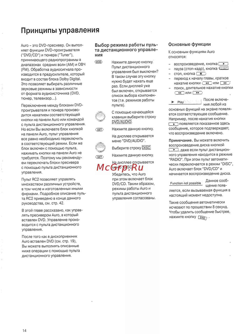 Принципы управления Auro это DVD пресивер Он выпол няет функции DVD проигрывателя DVD CD и тюнера Tuner принимающего радиопрограммы в диапазонах средних волн АМ и ОВЧ FM Обработка аудиосигнала про изводится в предусилителе который входит в состав блока Dolby Digital Это позволяет выбирать различные звуковые режимы в зависимости от формата аудиоисточника DVD тюнер телевизор Переключение между блоками DVDпроигрывателя и тюнера произво дится нажатием соответствующей кнопки на панели Auro или командой с пульта дистанционного управления Но если Вы включаете блок кнопкой на панели Auro пульт управления все равно необходимо переключить в соответствующий режим Если же блок включен с помощью пульта нажимать кнопки на панели Auro не требуется Поэтому мы рекоменду ем переключать блоки пресивера с помощью пульта дистанционного управления Пульт RC2 позволяет управлять множеством различных устройств в том числе и изготовленных иными фирмами Подробное описание пуль та RC2 приведено в конце данного руководства см стр 42 В этой главе рассказано как управ лять пресивером Auro в который вставлен DVD Управление произ водится с пульта дистанционного управления После того как в дископриемник Auro вставлен DVD см стр 19 Вы можете выполнять описанные ниже операции с помощью пульта дистанционного управления 14 Выбор режима работы пуль та дистанционного управле ния MODJ Нажмите данную кнопку Пульт дистанционного управления был выключен В таком случае эту кнопку нужно будет нажать еще раз Если дисплей уже был включен открывается список выбора компонен тов т е режимов работы пульта С помощью качающейся клавиши выберите строку DVD AUDiO SET Нажмите данную кнопку На дисплее открывается меню DVD AUDIO Выберите строку DISC SET Нажмите данную кнопку На дисплее открывается меню DISC Убедитесь что Auro при этом включает блок DVD CD Таким образом режимы работы Auro и пульта дистанционного управления согласованы Основные функции К основным функциям Auro относятся воспроизведение кнопка i пауза стоп кадр кнопка Саш стоп кнопка i и переход к началу главы краткое нажатие кнопки CJELJ или I У поиск длительное нажатие кнопки га или После включеPlay i _ ния любой из основных функций на экране появля ется соответствующее сообщение Например после нажатия кнопки П появляется показанное здесь сообщение которое подтверждает что воспроизведение включено Примечание Вы можете включить воспроизведение диска кнопкой I I даже если пульт дистанцион ного управления находится в режиме RADIO При этом пульт автомати чески переключается в режим DISC Auro включает блок DVD CD и начинается воспроизведение диска Данное сообFunction not possible щение появ ляется если вызываемая функция в настоящий момент недоступна Такие сообщения автоматически исчезают по прошествии 8 секунд Чтобы удалить сообщение быстрее нажмите кнопку