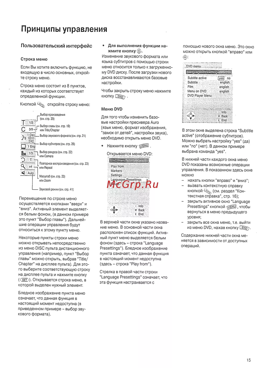 Принципы управления Пользовательский интерфейс Строка меню Если Вы хотите включить функцию не входящую в число основных открой те строку меню Строка меню состоит из 8 пунктов каждый из которых соответствует определенной функции Для выполнения функции на жмите кнопку Изменение звукового формата или языка субтитров с помощью строки меню относится только к загруженно му DVD диску После загрузки нового диска восстанавливаются базовые настройки Чтобы закрыть строку меню нажмите кнопку помощью нового окна меню Это окно можно открыть кнопкой вправо или ок _DVD msnu Subtitle active yes no Subtitle snglish Film enghsk Menu on DVD english DVD PlaverMemr Кнопкой откройте строку меню Меню DVD т с Выбор произведения _Г см стр 20 1 2 г Выбор глазы см стр 19 3 9или Títie Chapter De _ rao Выбор звукового формата см стр 21 Выбор субтитров см стр 26 о 1 3 i Выбор ракурса см стр 22 L или Camera т г Повторное воспроизведение см стр 23 или Repeat Г Для того чтобы изменить базо вые настройки пресивера Auro язык меню формат изображения замок от детей настройки звука необходимо открыть меню DVD Нажмите кнопку Открывается меню DVD PlHV from Markers Auto Масштаб см стр 23 Settings или Zoom Languages Presettings Sound Звуковой режим см стр 41 Перемещение по строке меню осуществляется кнопками вверх и вниз Активный элемент выделяет ся белым фоном в данном примере это пункт Выбор главы Дальней шие операции управления будут относиться к этому пункту меню Некоторые пункты строки меню можно открывать непосредственно из меню DISC пульта дистанционного управления например пункт Выбор главы можно открыть выбрав Title Chapter на дисплее пульта Для это го выберите соответствующую строку на дисплее пульта и нажмите кнопку CSET Открывается строка меню в которой выделен нужный элемент A I info M Back T E End В верхней части окна указано назва ние меню В основной части окна расположен список функций Актив ный пункт меню выделяется белым фоном здесь строка Language Presettings Бледное изображение пункта означает что данная функция в настоящий момент недоступна здесь строка Play from O 2 Info и Back В этом окне выделена строка Subtitle active отображение субтитров Можно выбрать настройку yes да или по нет В данном примере выбрана команда yes В нижней части каждого окна меню DVD показаны возможные операции управления В показанном здесь окне можно нажать кнопки вправо и вниз вызвать контекстную справку кнопкой см раздел Кон текстная справка стр 16 закрыть активное окно Language Presettings кнопкой чтобы вернуться в меню предыдущего уровня закрыть все окна меню т е выйти из меню DVD нажав кнопку Содержание нижней части окна ме няется в зависимости от доступных операций Стрелка в правой части строки Language Presettings означает что эта функция настраивается с Бледное изображение пункта меню означает что данная функция в настоящий момент недоступна в приведенном примере выбор зву кового формата 15