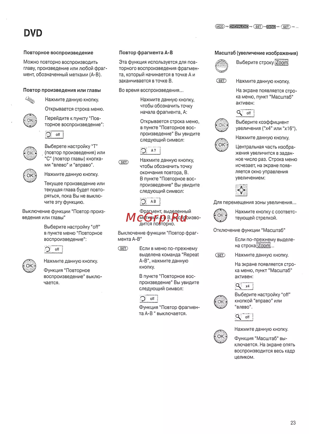 моо E225ES CsET 45JEra SET DVD Повторное воспроизведение Повтор фрагмента А В Можно повторно воспроизводить главу произведение или любой фраг мент обозначенный метками А В Эта функция используется для пов торного воспроизведения фрагмен та который начинается в точке А и заканчивается в точке В Повтор произведения или главы Нажмите данную кнопку Открывается строка меню Перейдите к пункту Пов торное воспроизведение Выберете настройку Т оь повтор произведения или С повтор главы кнопка ми влево и вправо Нажмите данную кнопку Текущее произведение или текущая глава будет повто ряться пока Вы не выклю чите эту функцию Выключение функции Повтор произ ведения или главы Выберите настройку off в пункте меню Повторное воспроизведение Во время воспроизведения Нажмите данную кнопку чтобы обозначить точку начала фрагмента А Открывается строка меню в пункте Повторное вос произведение Вы увидите следующий символ юн Нажмите данную кнопку чтобы обозначить точку окончания повтора В В пункте Повторное вос произведение Вы увидите следующий символ Функция Повторное воспроизведение выклю чается Выберите строку Z6dS Ж Нажмите данную кнопку На экране появляется стро ка меню пункт Масштаб активен Выберите коэффициент увеличения х4 или х16 Нажмите данную кнопку Центральная часть изобра жения увеличится в задан ное число раз Строка меню исчезает на экране появ ляется окно управления увеличением я Для перемещения зоны увеличения Фрагмент выделенный метками А и В воспроизво дится повторно Выключение функции Повтор фраг мента А В SET ЕСЛИ В меню по прежнему Нажмите данную кнопку Масштаб увеличение изображения выделена команда Repeat А В нажмите данную кнопку В пункте Повторное вос произведение Вы увидите следующий символ Функция Повтор фрагмен та А В выключается Нажмите кнопку с соответс твующей стрелкой Отключение функции Масштаб Если по прежнему выделе на строка ZoomL SET Нажмите данную кнопку На экране появляется стро ка меню пункт Масштаб активен ВJ Выберите настройку off кнопкой вправо или влево 0 off Нажмите данную кнопку Функция Масштаб вы ключается На экране опять воспроизводится весь кадр целиком 23