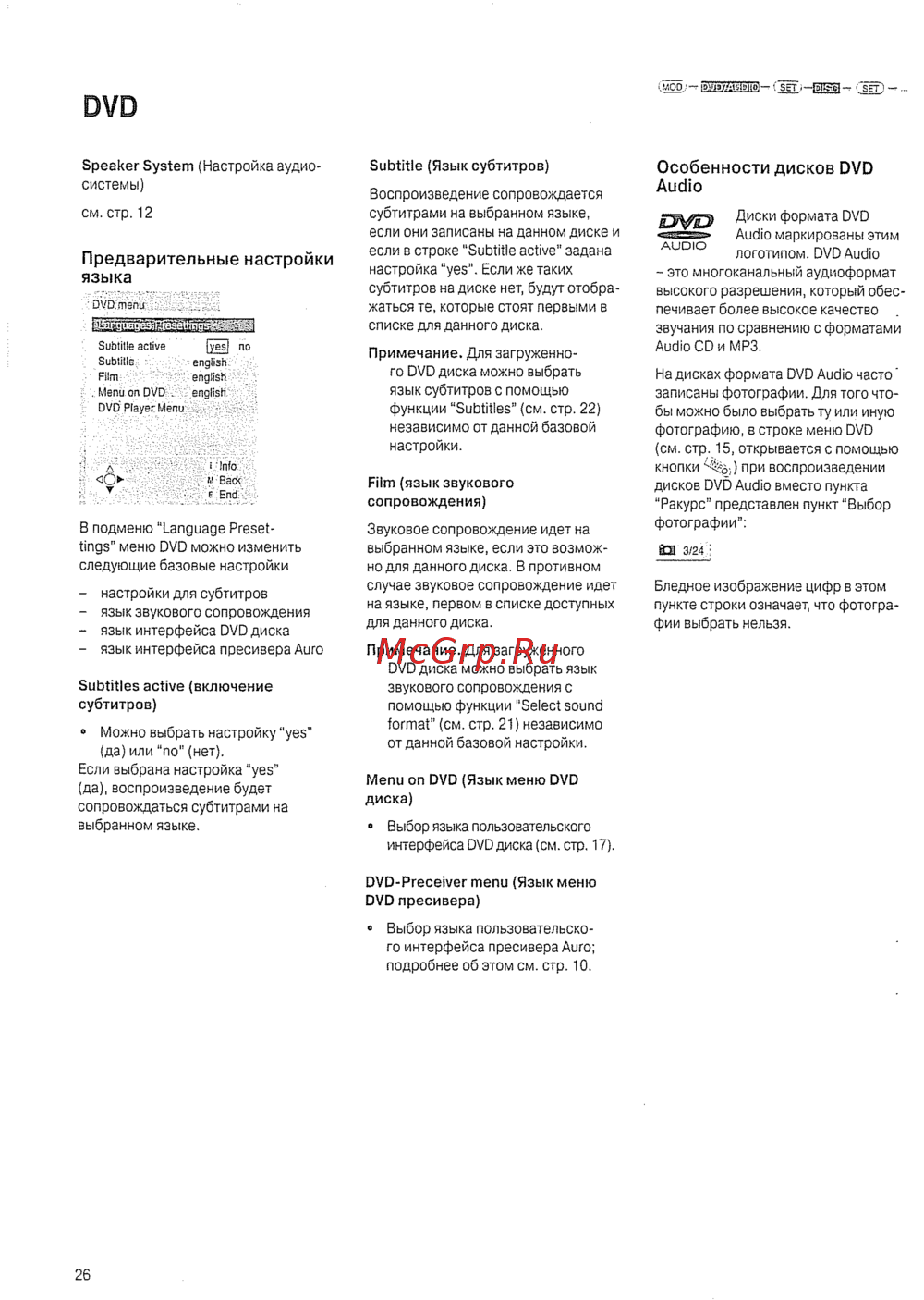 i MOD ís wAttiisiioi SET Г57Т с7 SET DVD Speaker System Настройка аудио системы см стр 12 Предварительные настройки языка DVD menu i Subtitle active yes Subtitle no engiish Film engiish Menu on DVD engiish DVD PlayerMenu Subtitle Язык субтитров Воспроизведение сопровождается субтитрами на выбранном языке если они записаны на данном диске и если в строке Subtitle active задана настройка yes Если же таких субтитров на диске нет будут отобра жаться те которые стоят первыми в списке для данного диска Примечание Для загруженно го DVD диска можно выбрать язык субтитров с помощью функции Subtitles см стр 22 независимо от данной базовой настройки Info Film язык звукового сопровождения В подменю Language Preset tings меню DVD можно изменить следующие базовые настройки настройки для субтитров язык звукового сопровождения язык интерфейса DVD диска язык интерфейса пресивера Auro Subtitles active включение субтитров Можно выбрать настройку yes да или по нет Если выбрана настройка yes да воспроизведение будет сопровождаться субтитрами на выбранном языке Звуковое сопровождение идет на выбранном языке если это возмож но для данного диска В противном случае звуковое сопровождение идет на языке первом в списке доступных для данного диска Примечание Для загруженного DVD диска можно выбрать язык звукового сопровождения с помощью функции Select sound format см стр 21 независимо отданной базовой настройки Menu on DVD Язык меню DVD диска Выбор языка пользовательского интерфейса DVD диска см стр 17 DVD Preceiver menu Язык меню DVD лресивера Выбор языка пользовательско го интерфейса пресивера Auro подробнее об этом см стр 10 26 Особенности дисков DVD Audio Диски формата DVD Audio маркированы этим логотипом DVD Audio это многоканальный аудиоформат высокого разрешения который обес печивает более высокое качество звучания по сравнению с форматами Audio CD и MP3 На дисках формата DVD Audio часто записаны фотографии Для того что бы можно было выбрать ту или иную фотографию в строке меню DVD см стр 15 открывается с помощью кнопки 4 при воспроизведении дисков DVD Audio вместо пункта Ракурс представлен пункт Выбор фотографии О 3 24 Бледное изображение цифр в этом пункте строки означает что фотогра фии выбрать нельзя