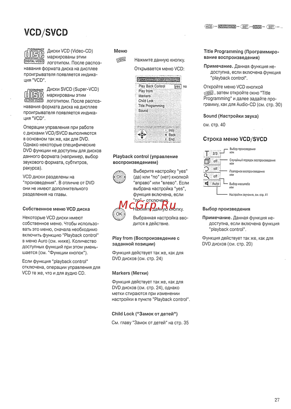 ÍMOD 1 p a iiataHo ЗЕТ ЧРП fsETJ VCD SVCD гтЛпгат Диски VCD Video CD IMJUSUD маркированы этим piGITflLVIDEO логотипом росле раСП03 навания формата диска на дисплее проигрывателя появляется индика ция VCD псомидст Диски SVCD Super VCD ш маркированы этим IS J PER УЮЕО логотипом После распоз навания формата диска на дисплее проигрывателя появляется индика ция VCD Операции управления при работе с дисками VCD SVCD выполняются в основном так же как для DVD Однако некоторые специфические DVD функции не доступны для дисков данного формата например выбор звукового формата субтитров ракурса Меню Нажмите данную кнопку Открывается меню VCD Play Back Control iyesi no Child СсскШЗД Title Progamming Title Programming Программиро вание воспроизведения Примечание Данная функция не доступна если включена функция playback control Откройте меню VCD кнопкой затем откройте окно Title Programming и далее задайте про грамму как для Audio CD см стр 30 Sound Настройки звука см стр 40 I info M Back Строка меню VCD SVCD Выбор проведения или Playback control управление воспроизведением Сл чейный порядок воспроизведения или VCD диски разделены на произведения В отличие от DVD они не имеют дополнительного разделения на главы Выберите настройку yes да или по нет кнопкой вправо или влево Если выбрана настройка yes функция включена если по отключена Собственное меню VCD диска Нажмите данную кнопку Выбор произведения Некоторые VCD диски имеют собственное меню Чтобы использо вать это меню сначала необходимо включить функцию Playback control в меню Auro см ниже Количество доступных функций при этом умень шается см Функции кнопок Выбранная настройка вво дится в действие Примечание Данная функция не Если функция playback control отключена операции управления для VCD те же что и для аудио CD Play from Воспроизведение с заданной позиции Позторное воспроизведение или Выбор месштгбе или Настройки заученна см стр 41 доступна если включена функция playback control Функция действует так же как для DVD дисков см стр 20 Функция действует так же как для DVD дисков см стр 24 Markers Метки Функция действует так же как для DVD дисков см стр 24 однако метки стираются при изменении настройки в пункте Playback control Child Lock Замок от детей См главу Замок от детей на стр 35 27