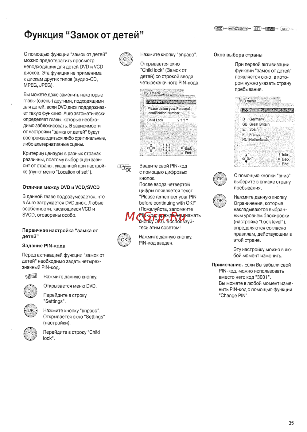 ScT ЗЕЗ SET ÎMOO7 Функция Замок от детей С помощью функции замок от детей можно предотвратить просмотр неподходящих для детей DVD и VCD дисков Эта функция не применима к дискам других типов аудио CD MPEG JPEG Вы можете даже заменить некоторые главы сцены другими подходящими для детей если DVD диск поддержива ет такую функцию Auro автоматически определяет главы которые необхо димо заблокировать В зависимости от настройки замка от детей будут воспроизводиться либо оригинальные либо альтернативные сцены Нажмите кнопку вправо Окно выбора страны Открывается окно Child lock Замок от детей со строкой ввода четырехзначного PIN кода DVD menu_ _ При первой активизации функции замок от детей появляется окно в кото ром нужно указать страну пребывания __ Pi ease define your Personal identification Number D Germany Child Lock GB Great Britain Г E r SpaiOOSBW V fH FranceiO V NL Netherlands other м Back Критерии цензуры в разных странах различны поэтому выбор сцен зави сит от страны указанной при настрой ке пункт меню Location of set Отличия между DVD и VCD SVCD В данной главе подразумевается что в Auro загружается DVD диск Любые особенности касающиеся VCD и SVCD оговорены особо Первичная настройка замка от детей Задание PiN кода Перед активацией функции замок от детей необходимо задать четырех значный Р1М код Нажмите данную кнопку Открывается меню DVD Перейдите в строку Settings j O Введите свой PIN код с помощью цифровых кнопок После ввода четвертой цифры появляется текст Please remember your PIN before continuing with OK Пожалуйста запомните PIN код прежде чем нажать кнопку ОК Воспользуй тесь этим советом Нажмите данную кнопку PIN код введен х fA Sack С помощью кнопки вниз выберите в списке страну пребывания Нажмите данную кнопку Ограничения которые накладываются выбран ным уровнем блокировки настройка Lock level определяются согласно правилам действующим в этой стране Эту настройку можно в лю бой момент изменить Примечание Если Вы забыли свой PIN код можно использовать вместо него код 3001 Вы можете в любой момент изме нить PIN код с помощью функции Change PIN Нажмите кнопку вправо Открывается окно Settings настройки Перейдите в строку Child lock 35