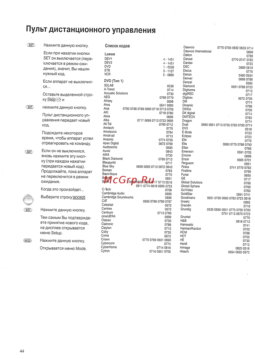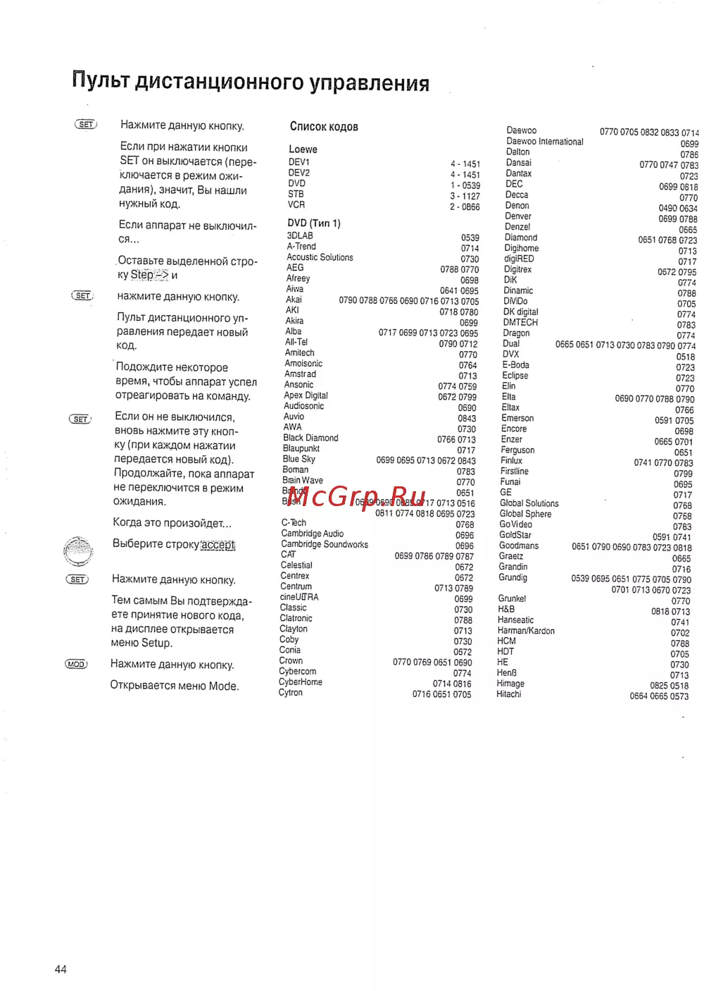 Пульт дистанционного управления SET Нажмите данную кнопку Если при нажатии кнопки SET он выключается пере ключается в режим ожи дания значит Вы нашли нужный код Если аппарат не выключил ся Оставьте выделенной стро ку Step и нажмите данную кнопку Пульт дистанционного уп равления передает новый код Подождите некоторое время чтобы аппарат успел отреагировать на команду Если он не выключился вновь нажмите эту кноп ку при каждом нажатии передается новый код Продолжайте пока аппарат не переключится в режим ожидания Когда это произойдет Список кодов Daewoo Loewe Daewoo international Dalton Dansai DEV1 4 1451 DEV2 DVD 4 1451 1 0539 3 1127 2 0866 STB VCR DVD Тип 1 3DLAB А Trend 0539 0714 Acoustic Solutions AEG Afreey Aiwa Akai AKI 0730 0788 0770 0698 0641 0695 0790 0708 0766 0690 0716 0713 0705 0718 0780 0699 0717 0699 0713 0723 0695 0790 0712 Akira Alba All Tel Amitech 0770 0764 Amoisonic Amstrad Ansonic 0713 0774 0759 Apex Digital Audiosonic Auvio AWA 0672 0799 0690 0843 0730 0766 0713 Black Diamond Blaupunkt Blue Sky Boman BiainWave Brandt Bush 0717 0699 0695 0713 0672 0843 0783 0770 0651 0699 0690 0689 0717 0713 0516 0811 0774 0818 0695 0723 C ech Cambridge Audio Выберите строку accept Нажмите данную кнопку Тем самым Вы подтвержда ете принятие нового кода на дисплее открывается меню Setup МОР Нажмите данную кнопку Открывается меню Mode 44 Cambridge Soundworks CAT Celestial Centrex Centrum cinellffRA Classic Clatronic Clayton Coby Conia Crown Cybercom CyberHome Cytron 0768 0696 0696 0699 0786 0789 0787 0672 0672 0713 0789 0699 0730 0788 0713 0730 0672 0770 0769 0651 0690 0774 0714 0816 0716 0651 0705 Dantax DEC Decca Denon Denver Denzel Diamond Digihome digiRED Diaitrex DiK Dinamic DMDo DK dioital DMTE CH Dragon Dual DVX E Boda Eclipse Elin Elta Eltax Emerson Encore Enzer Ferguson Finlux Firstline Funai GE Global Solutions Global Sphere Go Video GoldStar Goodmans Graetz Grandin Grundig 0770 0705 0832 0833 0714 0699 0786 0770 0747 0783 0723 0699 0818 0770 0490 0634 0699 0788 0665 0651 0768 0723 0713 0717 0672 0795 0774 0788 0705 0774 0 83 0774 0665 0651 0713 0730 0783 0790 0774 0518 0723 0723 0770 0690 0770 0788 0790 0766 0591 0705 0698 0665 0701 0651 0741 0770 0783 0799 0695 0717 0768 0768 0783 0591 0741 0651 0790 0690 0783 0723 0818 0665 0716 0539 0695 0651 0775 0705 0790 0701 0713 0670 0723 Grunke H B Hanseatic Harman Kardon HCM HDT HE Henß Himage Hitachi 0770 0818 0713 0741 0702 0788 0705 0730 0713 0825 0518 0664 0665 0573