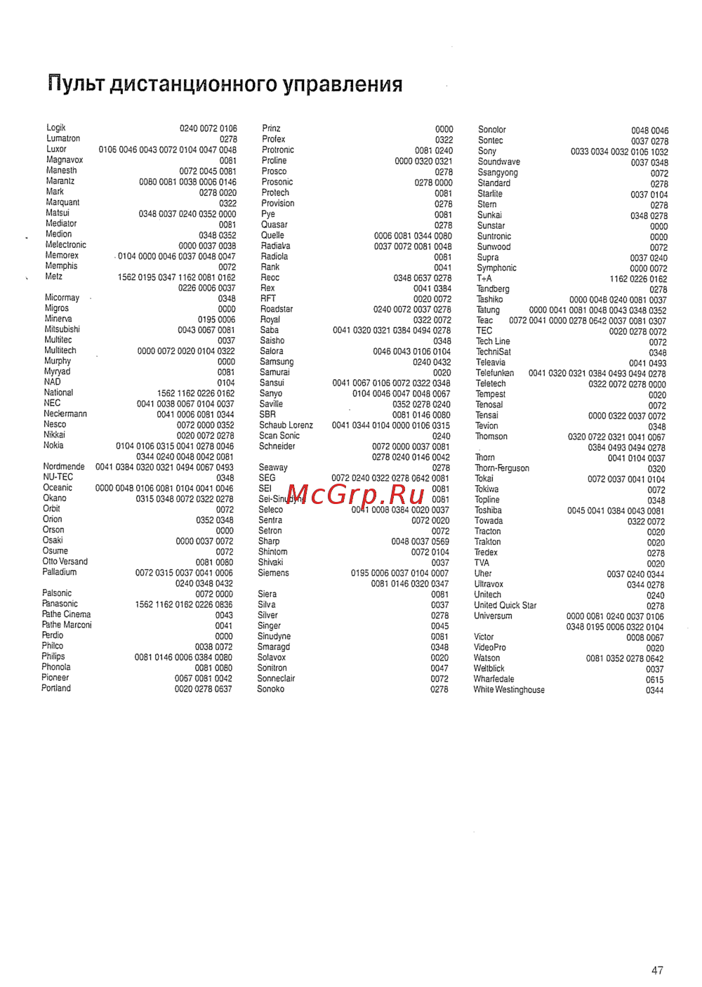 Пульт дистанционного управления Logik Lumatron Luxor Magnavox Manesth Marantz Mark Marquant Matsui Mediator Medion Melectronic Memorex Memphis Metz Micormay Migros Minerva Mitsubishi Multitec Multitech Murphy Myryad NAD National NEC Nectermann Nesco Nikkai Nokia Nordmende NU TEC Oceanic Okano Orbit Orion 0240 0072 0106 0278 0106 0046 0043 0072 0104 0047 0048 0081 0072 0045 0081 0080 0081 0038 0006 0146 0278 0020 0322 0348 0037 0240 0352 0000 0081 0348 0352 0000 0037 0038 0104 0000 0046 0037 0048 0047 0072 1562 0195 0347 1162 0081 0162 0226 0006 0037 0348 0000 0195 0006 0043 0067 0081 0037 0000 0072 0020 0104 0322 0000 0081 0104 1562 1162 0226 0162 0041 0038 0067 0104 0037 0041 0006 0081 0344 0072 0000 0352 0020 0072 0278 0104 0106 0315 0041 0278 0046 0344 0240 0048 0042 0081 0041 0384 0320 0321 0494 0067 0493 0348 0000 0048 0106 0081 0104 0041 0046 Palsonic Panasonic 0315 0348 0072 0322 0278 0072 0352 0348 0000 0000 0037 0072 0072 0081 0080 0072 0315 0037 0041 0006 0240 0348 0432 0072 0000 1562 1162 0162 0226 0836 Föthe Cinema Föthe Marconi Fferdio Philco Philips Phonola Pioneer 0043 0041 0000 0038 0072 0081 0146 0006 0384 0080 0081 0080 0067 0081 0042 Orson Osaki Osume Otto Versand Palladium Portland 0020 0278 0637 Prinz Profex Protronic Proline Proseo Prosonic Protech Provision Pye Quasar Quelle RadiaVa Radiola Rank Reoc Rex RFT Roadstar Royal Saba Saisho Salora Samsung Samurai Sansui Sanyo Saville SBR Schaub Lorenz Scan Sonic Schneider Seaway SÊG SEI Sei Sinudyne Seleco Sentra Setron Sharp Shintom Shivaki Siemens Siéra Silva Silver Singer Sinudyne Smaragd Solavox Sonitron Sonneclair Sonoko 0000 0322 0081 0240 0000 0320 0321 0278 0278 0000 0081 0278 0081 0278 0006 0081 0344 0080 0037 0072 0081 0048 0081 0041 0348 0637 0278 0041 0384 0020 0072 0240 0072 0037 0278 0322 0072 0041 0320 0321 0384 0494 0278 0348 0046 0043 0106 0104 0240 0432 0020 0041 0067 0106 0072 0322 0348 0104 0046 0047 0048 0067 0352 0278 0240 0081 0146 0080 0041 0344 0104 0000 0106 0315 0240 0072 0000 0037 0081 0278 0240 0146 0042 0278 0072 0240 0322 0278 0642 0081 0081 0081 0041 0008 0384 0020 0037 0072 0020 0072 0048 0037 0569 0072 0104 0037 0195 0006 0037 0104 0007 0081 0146 0320 0347 0081 0037 0278 0045 0081 0348 0020 0047 0072 0278 Sonolor Sontec Sony Soundwave Ssangyong Standard 0048 0046 0037 0278 0033 0034 0032 0106 1032 0037 0348 0072 0278 Starlite 0037 0104 Stern 0278 Sunkai 0348 0278 Sunstar 0000 Suntronic 0000 Sunwood 0072 Supra 0037 0240 Symphonie 0000 0072 T A 1162 0226 0162 Tandberg 0278 Tashiko 0000 0048 0240 0081 0037 Tatung 0000 0041 0081 0048 0043 0348 0352 Teac 0072 0041 0000 0278 0642 0037 0081 0307 TEC 0020 0278 0072 Tech Line 0072 TechniSat Teleavia 0348 0041 0493 Telefunken 0041 0320 0321 0384 0493 0494 0278 Teletech 0322 0072 0278 0000 Tempest Tenosal Tensai 0020 0072 O000 0322 0037 0072 Tevion Tnomson 0348 0320 0722 0321 0041 0067 0384 0493 0494 0278 0041 0104 0037 Ihorn fhorn ferguson Tokai Tokiwa 0320 0072 0037 0041 0104 0072 Topline Toshiba Towada Tracton Trakten Tredex TVA Uher Ultravox 0348 0045 0041 0384 0043 0081 Unitech United Quick Star Universum 0240 0278 0000 0081 0240 0037 0106 0348 0195 0006 0322 0104 Victor VideoPro Watson Weitblick Wharfedale White Westinghouse 0322 0072 0020 0020 0278 0020 0037 0240 0344 0344 0278 0008 0067 0020 0081 0352 0278 0642 0037 0615 0344 47