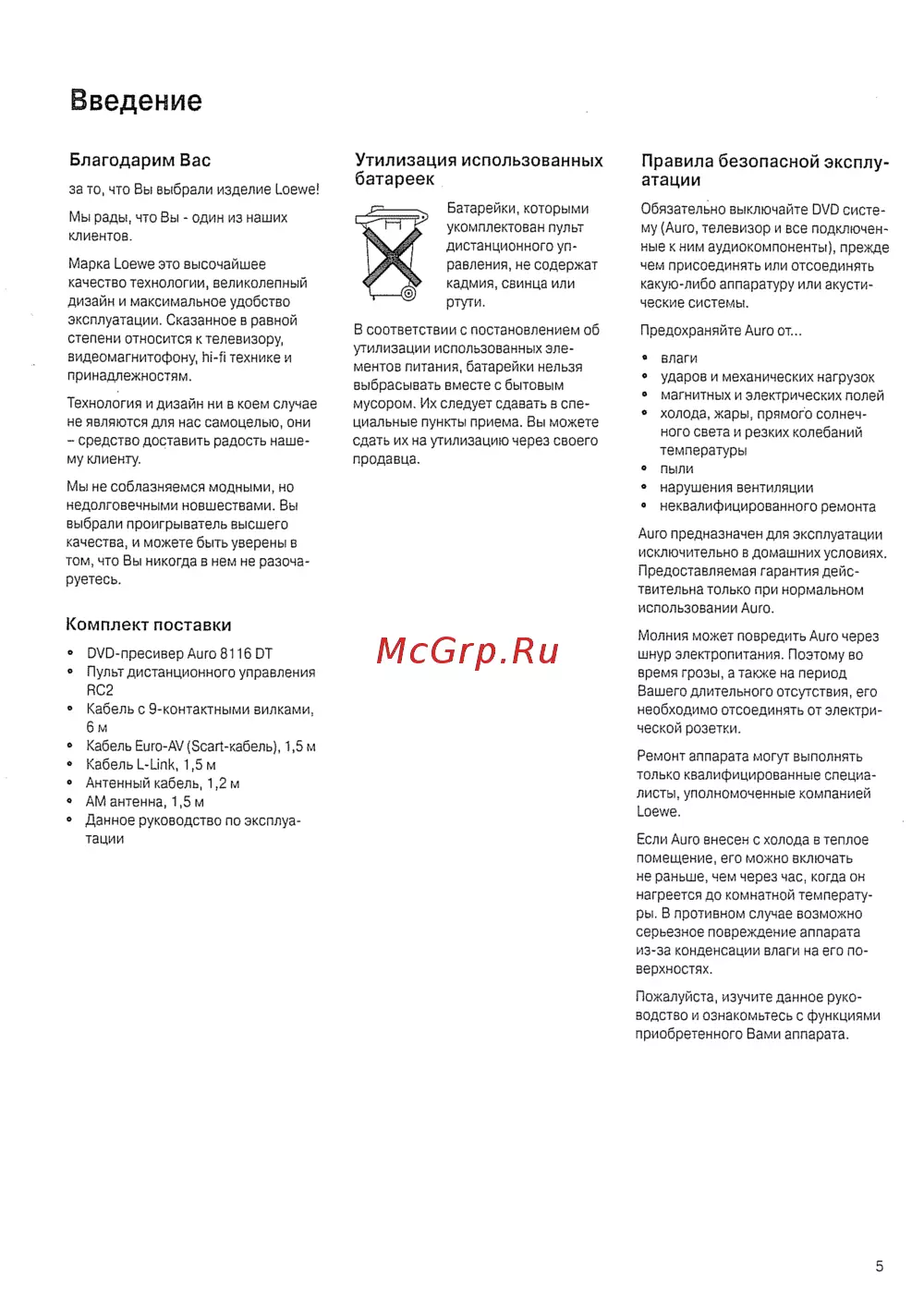 Введение Благодарим Вас за то что Вы выбрали изделие Loewe Мы рады что Вы один из наших клиентов Марка Loewe это высочайшее качество технологии великолепный дизайн и максимальное удобство эксплуатации Сказанное в равной степени относится к телевизору видеомагнитофону hi fi технике и принадлежностям Технология и дизайн ни в коем случае не являются для нас самоцелью они средство доставить радость наше му клиенту Мы не соблазняемся модными но недолговечными новшествами Вы выбрали проигрыватель высшего качества и можете быть уверены в том что Вы никогда в нем не разоча руетесь Комплект поставки DVD пресивер Auro 8116 DT Пульт дистанционного управления RC2 Кабель с 9 контактными вилками 6м Кабель Euro AV Scart кабель 1 5 м Кабель L Link 1 5 м Антенный кабель 1 2 м АМ антенна 1 5 м Данное руководство по эксплуа тации Утилизация использованных батареек Батарейки которыми укомплектован пульт дистанционного уп равления не содержат кадмия свинца или ртути В соответствии с постановлением об утилизации использованных эле ментов питания батарейки нельзя выбрасывать вместе с бытовым мусором Их следует сдавать в спе циальные пункты приема Вы можете сдать их на утилизацию через своего продавца Правила безопасной эксплу атации Обязательно выключайте DVD систе му Auro телевизор и все подключен ные к ним аудиокомпоненты прежде чем присоединять или отсоединять какую либо аппаратуру или акусти ческие системы Предохраняйте Auro от влаги ударов и механических нагрузок магнитных и электрических полей холода жары прямого солнеч ного света и резких колебаний температуры пыли нарушения вентиляции неквалифицированного ремонта Auro предназначен для эксплуатации исключительно в домашних условиях Предоставляемая гарантия дейс твительна только при нормальном использовании Auro Молния может повредить Auro через шнур электропитания Поэтому во время грозы а также на период Вашего длительного отсутствия его необходимо отсоединять от электри ческой розетки Ремонт аппарата могут выполнять только квалифицированные специа листы уполномоченные компанией Loewe Если Auro внесен с холода в теплое помещение его можно включать не раньше чем через час когда он нагреется до комнатной температу ры В противном случае возможно серьезное повреждение аппарата из за конденсации влаги на его по верхностях Пожалуйста изучите данное руко водство и ознакомьтесь с функциями приобретенного Вами аппарата 5