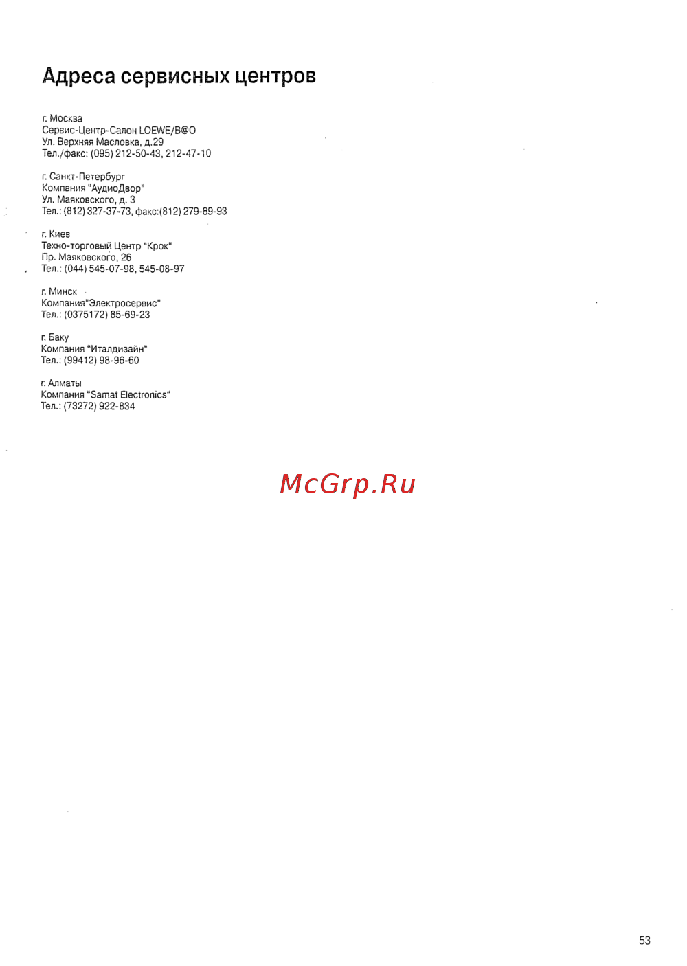Адреса сервисных центров г Москва Сервис Центр Салон LOEWE B O Ул Верхняя Масловка д 29 Тел факс 095 212 50 43 212 47 10 г Санкт Петербург Компания АудиоДвор Ул Маяковского д 3 Тел 812 327 37 73 факс 812 279 89 93 г Киев Техно торговый Центр Крок Пр Маяковского 26 Тел 044 545 07 98 545 08 97 г Минск Компания Электросервис Тел 0375172 85 69 23 г Баку Компания Италдизайн Тел 99412 98 96 60 г Алматы Компания Samat Electronics Тел 73272 922 834 53