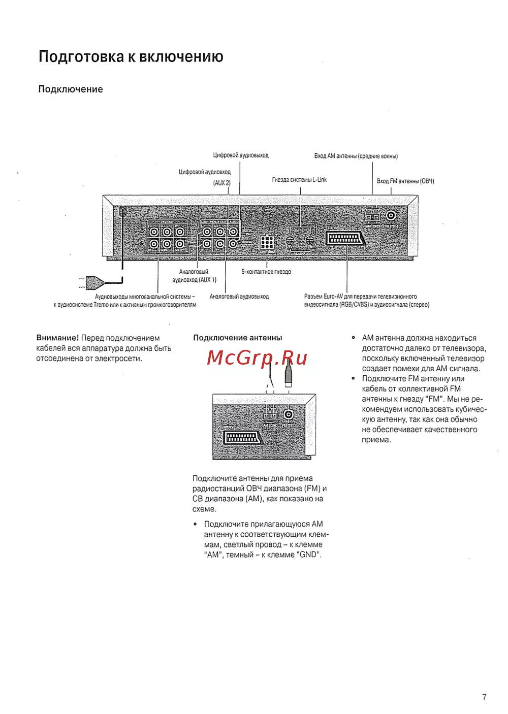 Подготовка к включению Подключение ВходАМ антенны средние ВОЛНЫ Цифровой аудиовыход Цифровой аудиовход Гнезда системы L Unk AUX2 I Вход FM антенны ОВЧ I ООО О О О SSS Аналоговый 9 контактное гнездо аудиовход AUX1 Аудиовыходы многоканальной системы Аналоговый аудиовыход к аудиосистеме Tremo или к активным громкоговорителям Внимание Перед подключением кабелей вся аппаратура должна быть отсоединена от электросети Разъем Euro AV для передачи телевизионного видеосигнала RGB CVBS и аудиосигнала стерео Подключение антенны Подключите антенны для приема радиостанций ОВЧ диапазона РМ и СВ диапазона АМ как показано на схеме Подключите прилагающуюся АМ антенну к соответствующим клем мам светлый провод к клемме АМ темный к клемме ОНО о АМ антенна должна находиться достаточно далеко от телевизора поскольку включенный телевизор создает помехи для АМ сигнала 0 Подключите РМ антенну или кабель от коллективной РМ антенны к гнезду РМ Мы не ре комендуем использовать кубичес кую антенну так как она обычно не обеспечивает качественного приема