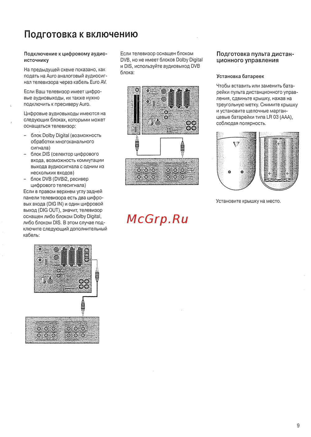 Подготовка к включению Подключение к цифровому аудио источнику На предыдущей схеме показано как подать на Auro аналоговый аудиосиг нал телевизора через кабель Euro AV Если телевизор оснащен блоком DVB но не имеет блоков Dolby Digital и DIS используйте аудиовыход DVB блока Цифровые аудиовыходы имеются на следующих блоках которыми может оснащаться телевизор ООО ООО Установка батареек Чтобы вставить или заменить бата рейки пульта дистанционного управ ления сдвиньте крышку нажав на треугольную метку Снимите крышку и установите щелочные марган цевые батарейки типа 1В 03 ААА соблюдая полярность Если Ваш телевизор имеет цифро вые аудиовыходы их также нужно подключить к пресиверу Auro блок Dolby Digital возможность обработки многоканального сигнала блок DIS селектор цифрового входа возможность коммутации выхода аудиосигнала с одним из нескольких входов блок DVB DVBÍ2 ресивер цифрового телесигнала Если в правом верхнем углу задней панели телевизора есть два цифро вых входа DIG IN и один цифровой выход DIG OUT значит телевизор оснащен либо блоком Dolby Digital либо блоком DIS В этом случае под ключите следующий дополнительный кабель Подготовка пульта дистан ционного управления ООО о о р óóóóóó Установите крышку на место ОСО 000 9