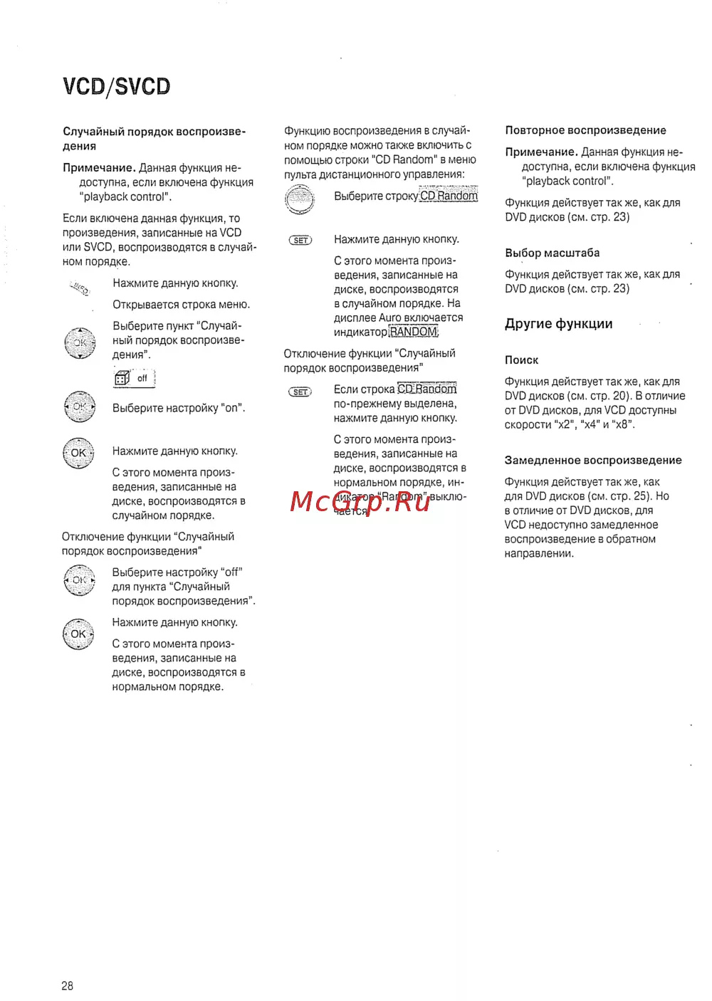 VCD SVCD Случайный порядок воспроизве дения Примечание Данная функция не доступна если включена функция playback control Если включена данная функция то произведения записанные на VCD или SVCD воспроизводятся в случай ном порядке Нажмите данную кнопку Открывается строка меню Выберите пункт Случай ji ный порядок воспроизведения Функцию воспроизведения в случай ном порядке можно также включить с помощью строки CD Random в меню пульта дистанционного управления Выберите строку CD Random П рй Нажмите данную кнопку С этого момента произ ведения записанные на диске воспроизводятся в случайном порядке Отключение функции Случайный порядок воспроизведения Выберите настройку off для пункта Случайный порядок воспроизведения Нажмите данную кнопку ОК 28 С этого момента произ ведения записанные на диске воспроизводятся в нормальном порядке Примечание Данная функция не доступна если включена функция playback control Функция действует так же как для DVD дисков см стр 23 SET Нажмите данную кнопку С этого момента произ ведения записанные на диске воспроизводятся в случайном порядке На дисплее Айго включается индикатор ЯАИРОМ Отключение функции Случайный порядок воспроизведения Я о j ВЫ ерИТе Ha Повторное воспроизведение Если строка ВаЬЯ по прежнему выделена нажмите данную кнопку С этого момента произ ведения записанные на диске воспроизводятся в нормальном порядке ин дикатор Random выклю чается Выбор масштаба Функция действует так же как для DVD дисков см стр 23 Другие функции Поиск Функция действует так же как для DVD дисков см стр 20 В отличие от DVD дисков для VCD доступны скорости х2 х4 и х8 Замедленное воспроизведение Функция действует так же как для DVD дисков см стр 25 Но в отличие от DVD дисков для VCD недоступно замедленное воспроизведение в обратном направлении