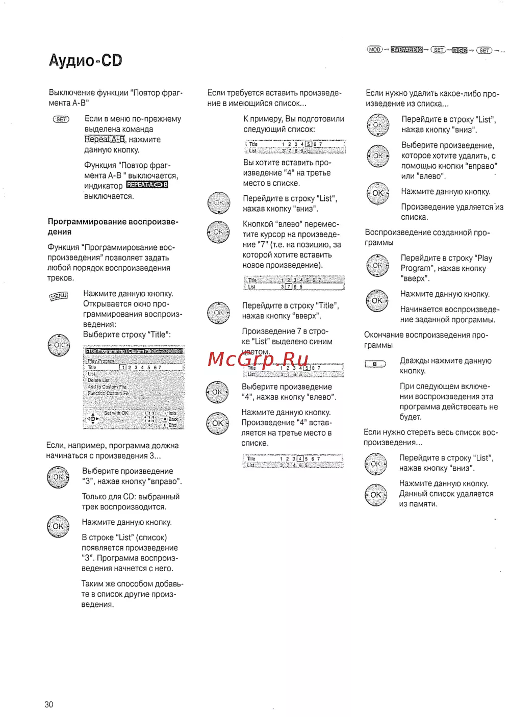 MÖb f6 ayfäaia o ЗЕТу ЧоЛЗЯ SET Аудио CD Выключение функции Повтор фраг мента А В SET Если требуется вставить произведе ние в имеющийся список Если нужно удалить какое либо про изведение из списка Если в меню по прежнему выделена команда Йереа АШ нажмите данную кнопку К примеру Вы подготовили следующий список Функция Повтор фраг мента А В выключается Вы хотите вставить про изведение 4 на третье место в списке RS EftW5 B выключается Программирование воспроизве дения Функция Программирование вос произведения позволяет задать любой порядок воспроизведения треков Нажмите данную кнопку Открывается окно про граммирования воспроиз ведения Выберите строку Title тае Перейдите в строку List нажав кнопку вниз Выберите произведение которое хотите удалить с помощью кнопки вправо или влево 1 з 4 Т Нажмите данную кнопку Перейдите в строку List нажав кнопку вниз Произведение удаляется из списка Кнопкой влево перемес тите курсор на произведе ние 7 т е на позицию за которой хотите вставить новое произведение Tils J 2 3 t 5 7 Lisi зЩб 5 Воспроизведение созданной про граммы Перейдите в строку Play Program нажав кнопку вверх i Нажмите данную кнопку Перейдите в строку Title нажав кнопку вверх Произведение 7 в стро ке List выделено синим цветом Начинается воспроизведе ние заданной программы Окончание воспроизведения про граммы jи Tils 1 Гз 4077 iS Выберите произведение 4 нажав кнопку влево Если например программа должна начинаться с произведения 3 Нажмите данную кнопку Произведение 4 встав ляется на третье место в списке 1 ь t Выберите произведение 3 нажав кнопку вправо Только для СО выбранный трек воспроизводится Нажмите данную кнопку В строке List список появляется произведение 3 Программа воспроиз ведения начнется с него Таким же способом добавь те в список другие произ ведения 30 4 55 7 у Дважды нажмите данную кнопку При следующем включе нии воспроизведения эта программа действовать не будет Если нужно стереть весь список вос произведения Перейдите в строку List нажав кнопку вниз Нажмите данную кнопку Данный список удаляется из памяти