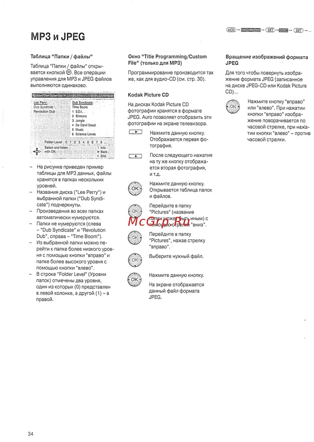 MÖDJ T ЕИоетЗй CsËTj iâ ÇSËT MP3 и JPEG Таблица Папки файлы Таблица Папки файлы откры вается кнопкой Все операции управления для МРЗ и JPEG файлов выполняются одинаково Окно Title Programming Custom File только для МРЗ Вращение изображений формата JPEG Программирование производится так же как для аудио CD см стр 30 Для того чтобы повернуть изобра жение формата JPEG записанное на диске JPEG CD или Kodak Picture CD Kodak Picture CD L e Регу Dub Syndicate Dun Svndisate Time Boom Revolution Dub 1SD L 2 Blinkers 3 Jungle 4 De Devil Dead На дисках Kodak Picture CD фотографии хранятся в формате JPEG Auro позволяет отобразить эти фотографии на экране телевизора 5 Muse IJ 6 Science Loves A Folder Levs С 1 Select arid listen LwilhOK n На рисунке приведен пример таблицы для МРЗ данных файлы хранятся в папках нескольких уровней Названия диска Lee Perry и выбранной папки Dub Syndi cate подчеркнуты Произведения во всех папках автоматически нумеруются Папки не нумеруются слева Dub Syndicate и Revolution Dub справа Time Boom Из выбранной папки можно пе рейти к папке более низкого уров ня с помощью кнопки вправо и лапке более высокого уровня с помощью кнопки влево В строке Folder Leve Уровни папок отмечены два уровня один из которых 0 представлен в левой колонке а другой 1 в правой 34 Нажмите данную кнопку Отображается первая фо тография После следующего нажатия на ту же кнопку отобража ется вторая фотография ит д Нажмите данную кнопку Открывается таблица папок и файлов Перейдите в папку Pictures название папки может быть иным с помощью стрелки вниз Перейдите в папку Pictures нажав стрелку вправо Выберите нужный файл Нажмите данную кнопку На экране отображается данный файл формата JPEG Нажмите кнопку вправо или влево При нажатии кнопки вправо изобра жение поворачивается по часовой стрелке при нажа тии кнопки влево против часовой стрелки