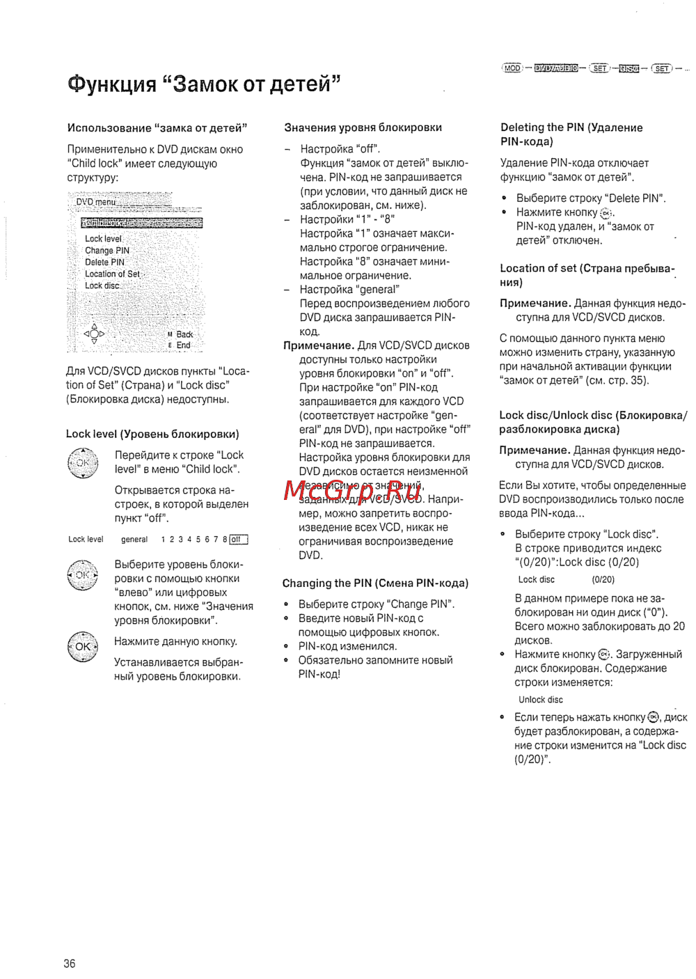 CSET I Функция Замок от детей Использование замка от детей Значения уровня блокировки Применительно к DVD дискам окно Child lock имеет следующую структуру Настройка off Функция замок от детей выклю чена PIN код не запрашивается при условии что данный диск не заблокирован см ниже Настройки 1 8 Настройка 1 означает макси мально строгое ограничение Настройка 8 означает мини мальное ограничение Настройка general Перед воспроизведением любого DVD диска запрашивается PINкод Примечание Для VCD SVCD дисков доступны только настройки уровня блокировки on и off При настройке on PIN код запрашивается для каждого VCD соответствует настройке gen eral для DVD при настройке off PIN код не запрашивается Настройка уровня блокировки для DVD дисков остается неизменной независимо от значений заданных для VCD SVCD Напри мер можно запретить воспро изведение BcexVCD никак не ограничивая воспроизведение DVD у 1 4 Lock level У Change Delete PIN PIN Location of Set Lock disc M Bam г End Для VCD SVCD дисков пункты Loca tion of Set Страна и Lock disc Блокировка диска недоступны Lock level Уровень блокировки Перейдите к строке Lock level в меню Child lock Открывается строка на строек в которой выделен пункт off Lock level general 1 2 3 4 5 6 7 8 oft Выберите уровень блоки ровки с помощью кнопки влево или цифровых кнопок см ниже Значения уровня блокировки Нажмите данную кнопку Устанавливается выбран ный уровень блокировки Changing the PIN Смена PIN кода Выберите строку Change PIN Введите новый PIN код с помощью цифровых кнопок PIN код изменился Обязательно запомните новый PIN код Deleting the PIN Удаление PIN кода Удаление PIN кода отключает функцию замок от детей Выберите строку Delete PIN Нажмите кнопку PIN код удален и замок от детей отключен Location of set Страна пребыва ния Примечание Данная функция недо ступна для VCD SVCD дисков С помощью данного пункта меню можно изменить страну указанную при начальной активации функции замок от детей см стр 35 Lock disc Unlock disc Блокировка разблокировка диска Примечание Данная функция недо ступна для VCD SVCD дисков Если Вы хотите чтобы определенные DVD воспроизводились только после ввода PIN кода Выберите строку Lock disc В строке приводится индекс 0 20 Lock disc 0 20 Lock disc 0 20 В данном примере пока не за блокирован ни один диск 0 Всего можно заблокировать до 20 дисков Нажмите кнопку Загруженный диск блокирован Содержание строки изменяется Unlock disc Если теперь нажать кнопку Диск будет разблокирован а содержа ние строки изменится на Lock disc 0 20 36
