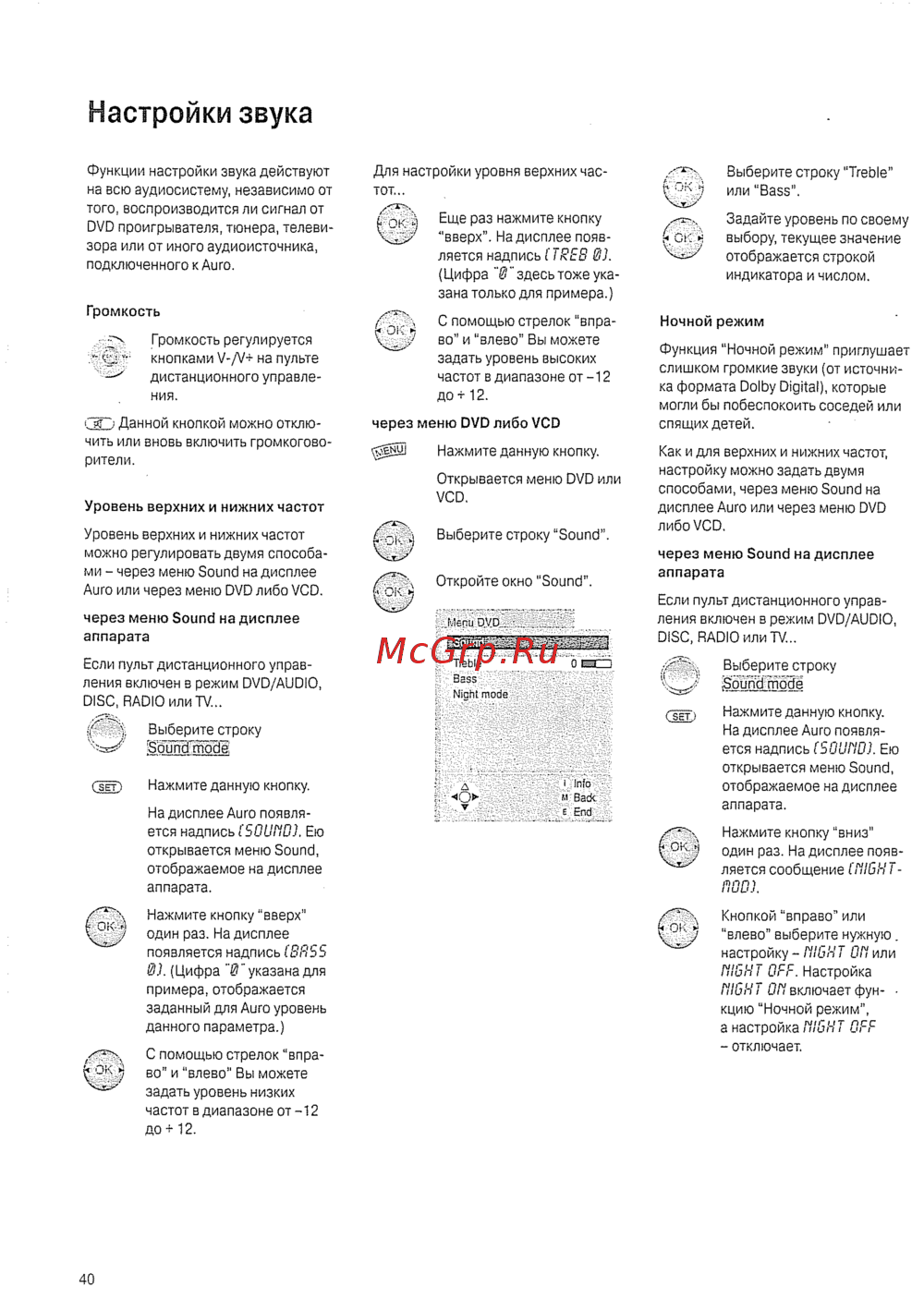 Настройки звука Функции настройки звука действуют на всю аудиосистему независимо от того воспроизводится ли сигнал от DVD проигрывателя тюнера телеви зора или от иного аудиоисточника подключенного к Auro Громкость Громкость регулируется кнопками V V на пульте дистанционного управле ния I аг Данной кнопкой можно отклю чить или вновь включить громкогово рители Уровень верхних и нижних частот Уровень верхних и нижних частот можно регулировать двумя способа ми через меню Sound на дисплее Auro или через меню DVD либо VCD через меню Sound на дисплее аппарата Если пульт дистанционного управ ления включен в режим DVD AUDIO DISC RADIO или TV Для настройки уровня верхних час тот Еще раз нажмите кнопку вверх На дисплее появ ляется надпись TRES 8 Цифра Гздесьтожеука зана только для примера С помощью стрелок вправо и влево Вы можете задать уровень высоких частот в диапазоне от 12 до 12 через меню DVD либо VCD Нажмите данную кнопку Открывается меню DVD или VCD q Выберите строку Sound Откройте окно Sound Treble 0 Bass Night mode Нажмите кнопку вверх один раз На дисплее появляется надпись 88SS 8 Цифра Г указана для примера отображается заданный для Auro уровень данного параметра С помощью стрелок впра во и влево 1 Вы можете задать уровень низких частот в диапазоне от 12 до 12 40 Ночной режим Функция Ночной режим приглушает слишком громкие звуки от источни ка формата Dolby Digital которые могли бы побеспокоить соседей или спящих детей Как и для верхних и нижних частот настройку можно задать двумя способами через меню Sound на дисплее Auro или через меню DVD либо VCD через меню Sound на дисплее аппарата Выберите строку ffoundTnode CSETJ Нажмите данную кнопку Д G На дисплее Auro появля ется надпись SQUriDJ Ею открывается меню Sound отображаемое на дисплее аппарата Задайте уровень по своему выбору текущее значение отображается строкой индикатора и числом Если пульт дистанционного управ ления включен в режим DVD AUDIO DISC RADIO или TV Menu DVD Выберите строку Sb unci mocie CSËT Нажмите данную кнопку Выберите строку Treble или Bass V 1 MBade EEnd На дисплее Auro появля ется надпись 30иГ10 Ею открывается меню Sound отображаемое на дисплее аппарата Нажмите кнопку вниз один раз На дисплее появ ляется сообщение 8Ю8 Т 8001 Кнопкой вправо или влево выберите нужную настройку 8I0HT 08 или 8 6НТ OFF Настройка 8IG8T 08включает фун кцию Ночной режим а настройка 8IGHT OFF отключает