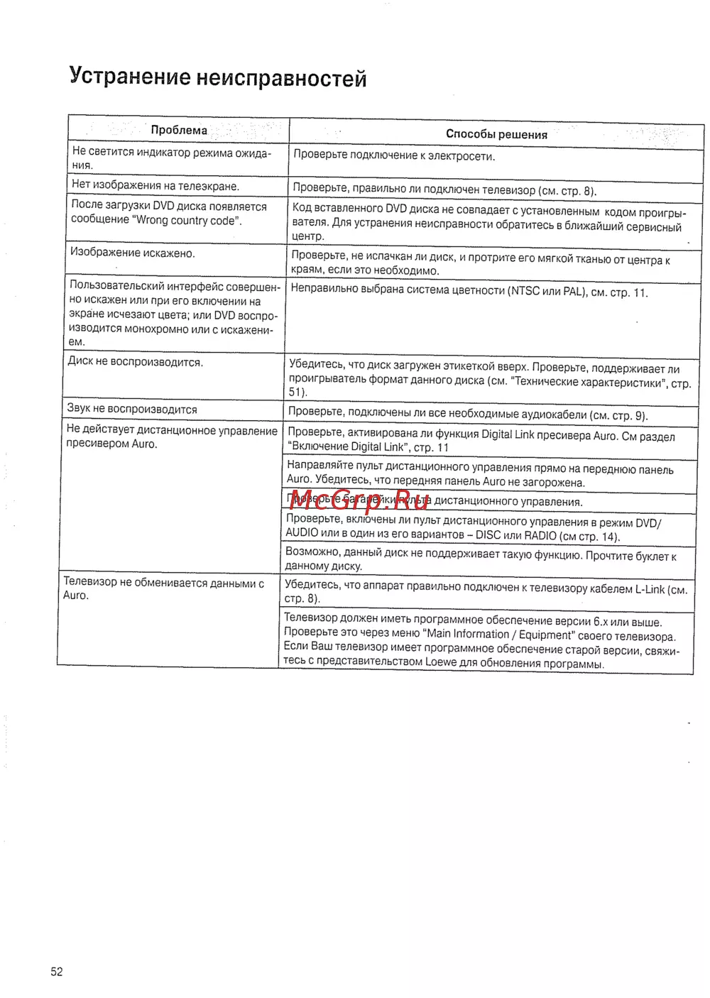 Устранение неисправностей Проблема Способы решения Не светится индикатор режима ожида ния Проверьте подключение к электросети Нет изображения на телеэкране Проверьте правильно ли подключен телевизор см стр 8 После загрузки DVD диска появляется сообщение Wrong country code Код вставленного DVD диска не совпадает с установленным кодом проигры вателя Для устранения неисправности обратитесь в ближайший сервисный центр Изображение искажено Проверьте не испачкан ли диск и протрите его мягкой тканью от центра к краям если это необходимо Пользовательский интерфейс совершен но искажен или при его включении на экране исчезают цвета или DVD воспро изводится монохромно или с искажени ем Неправильно выбрана система цветности NTSC или PAL см стр 11 Диск не воспроизводится Убедитесь что диск загружен этикеткой вверх Проверьте под держивает ли проигрыватель формат данного диска см Технические характеристики стр 51 Звук не воспроизводится Проверьте подключены ли все необходимые аудиокабели см стр 9 Не действует дистанционное управление пресивером Auro Проверьте активирована ли функция Digital Link пресивера Auro См раздел Включение Digital Link стр 11 Направляйте пульт дистанционного управления прямо на переднюю панель Auro Убедитесь что передняя панель Auro не загорожена Проверьте батарейки пульта дистанционного управления Проверьте включены ли пульт дистанционного управления в режим DVD AUDIO или в один из его вариантов DISC или RADIO см сто 14 Возможно данный диск не поддерживает такую функцию Прочтите буклет к данному диску Телевизор не обменивается данными с Auro Убедитесь что аппарат правильно подключен к телевизору кабелем L Link см стр 8 1елевизор должен иметь программное обеспечение версии 6 x или выше Проверьте это через меню Main Information Equipment своего телевизора сли Ваш телевизор имеет программное обеспечение старой версии свяжи тесь с представительством Loewe для обновления программы 52