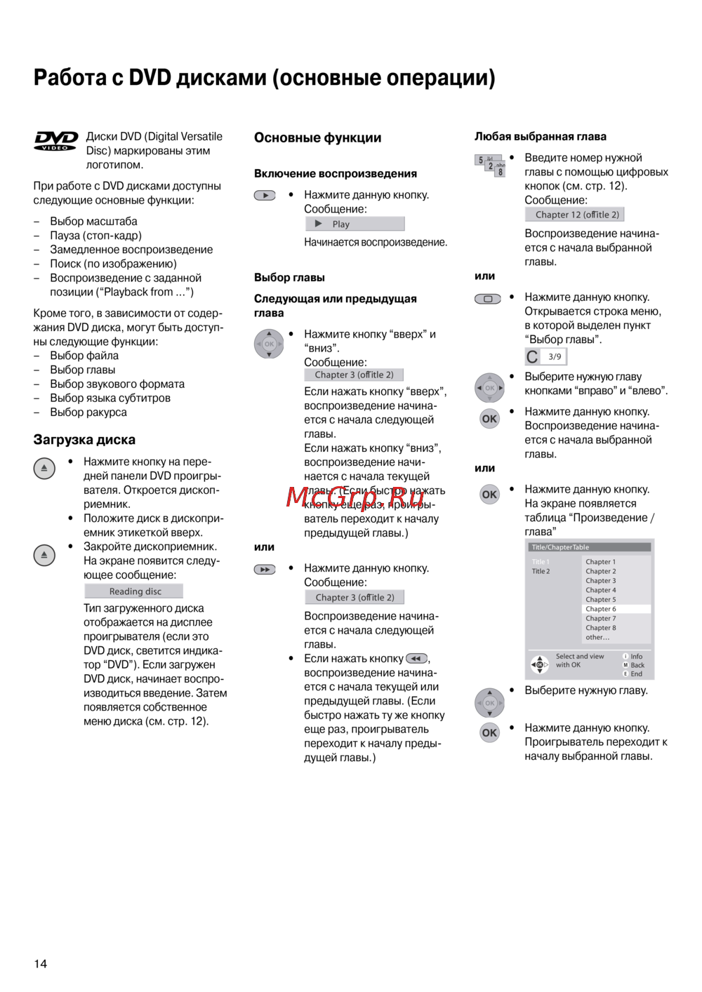 Узнайте о ключевых функциях DVD дисков, таких как выбор главы, пауза и замедленное воспроизведение. Пошаговая инструкция по загрузке и управлению дисками.