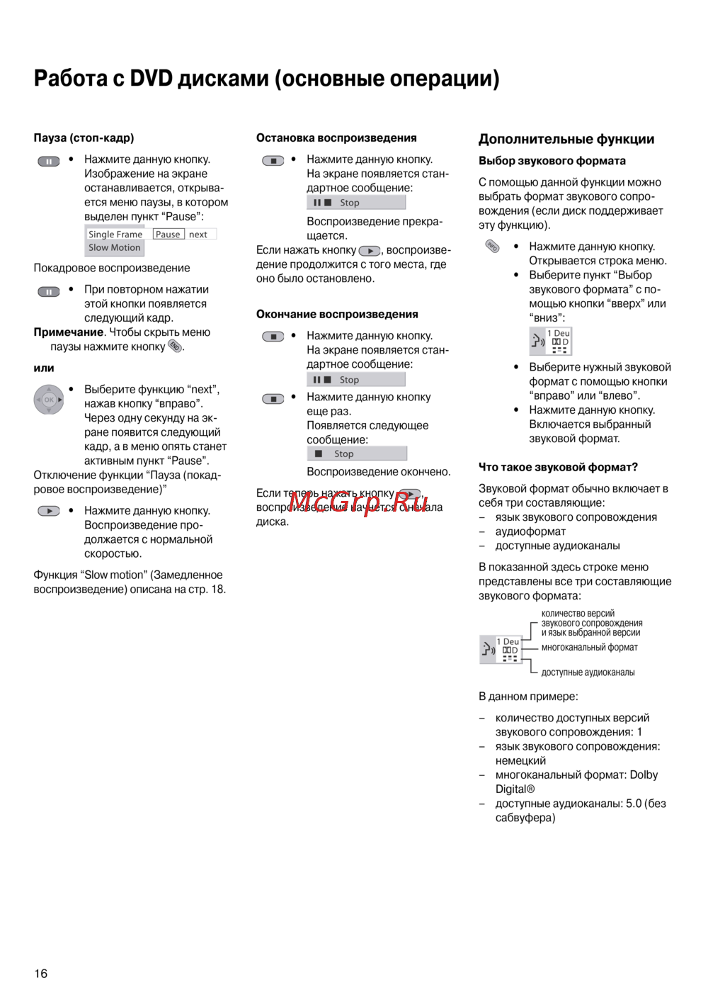 Узнайте, как управлять воспроизведением DVD-дисков, включая паузу, покадровое воспроизведение и выбор звукового формата. Простые шаги для комфортного просмотра.
