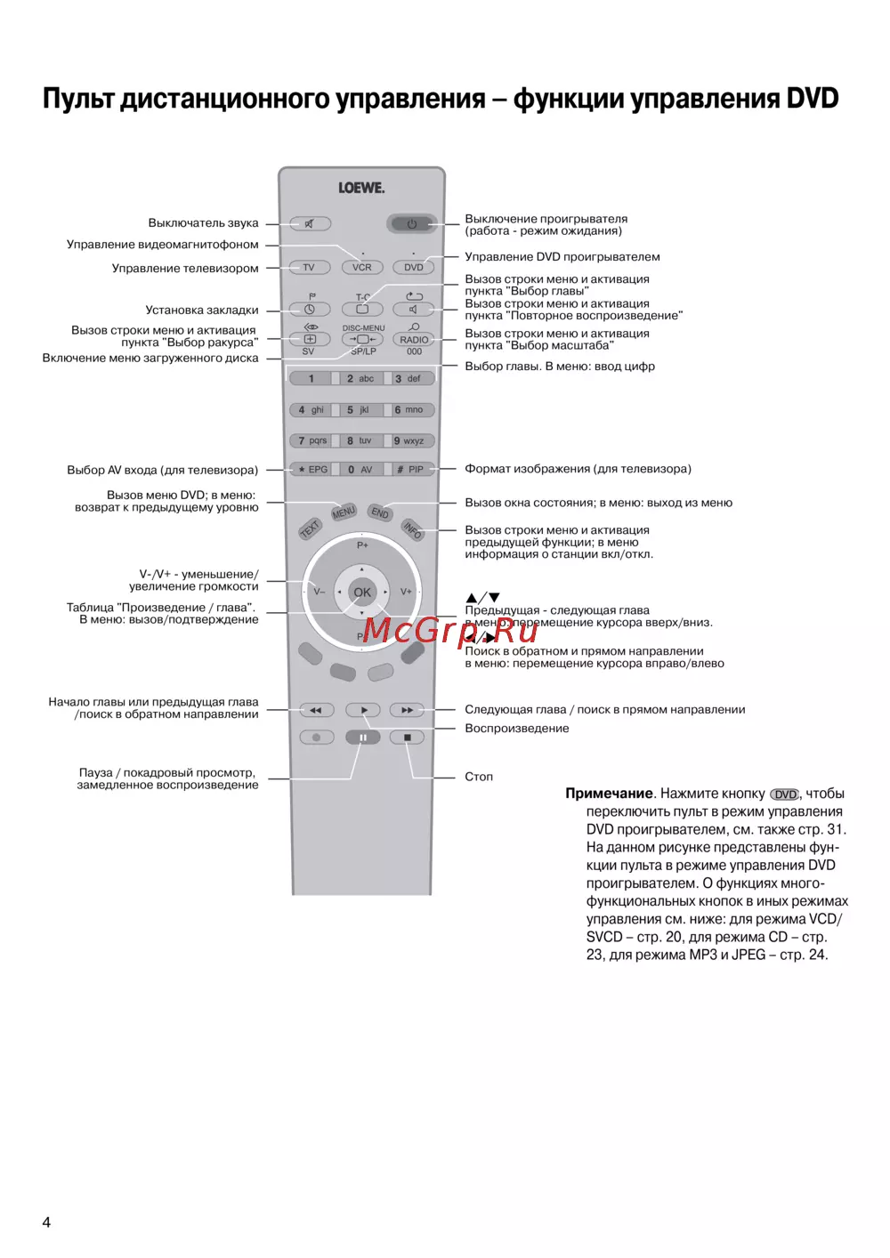 - Переключить пульт в режим управления dvd проигрывателем см также стр 31 на данном рисунке представлены фун кции пульта в режиме управления dvd проигрывателем о функциях много функциональных кнопок в иных режимах управления см ниже для режима vcd svcd стр 20 для режима cd стр 23 для режима mp3 и jpeg стр 24 p.4