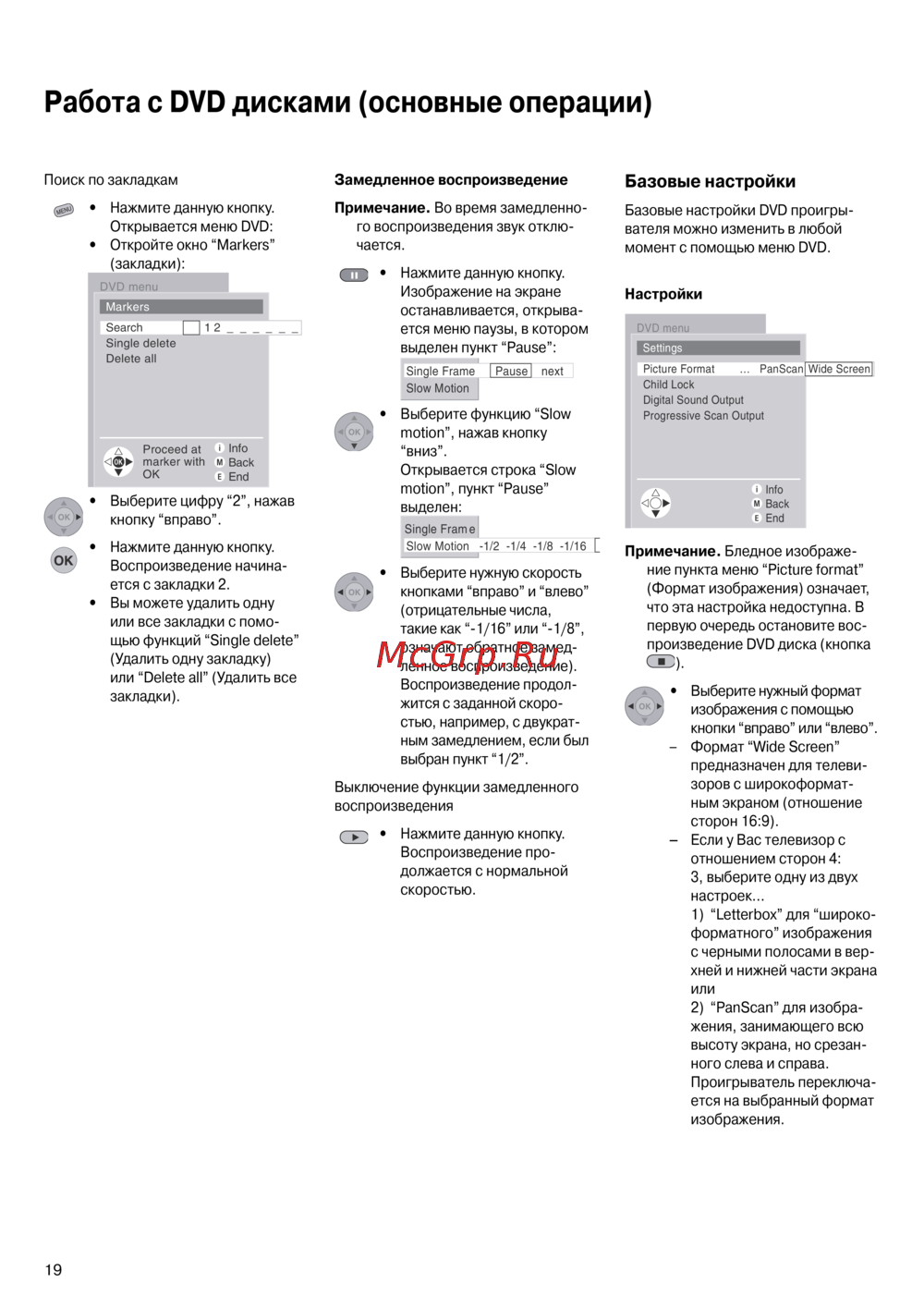 Узнайте, как управлять закладками на DVD, использовать замедленное воспроизведение и настраивать основные параметры вашего проигрывателя. Простые шаги для удобства.