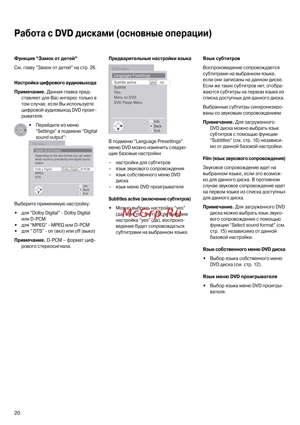Узнайте, как работать с DVD дисками, настраивать цифровой аудиовыход и выбирать языки субтитров и звукового сопровождения для комфортного просмотра.