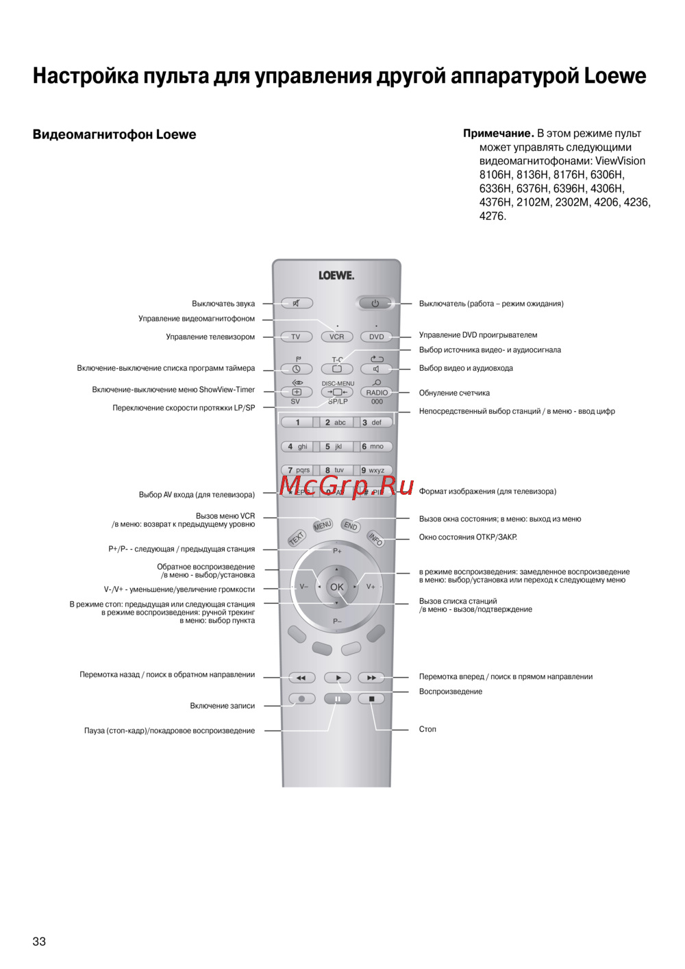 - Может управлять следующими видеомагнитофонами viewvision 8106h 8136h 8176h 6306h 6336h 6376h 6396h 4306h 4376h 2102m 2302m 4206 4236 4276 p.33