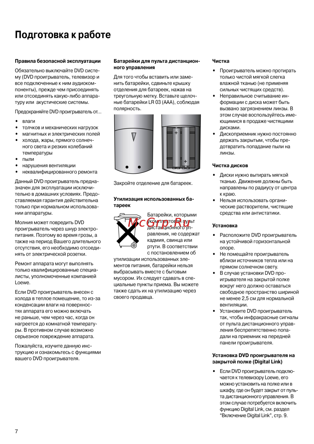 Изучите правила безопасной эксплуатации DVD проигрывателя, включая подготовку к работе, уход и утилизацию батареек. Обеспечьте долговечность устройства.