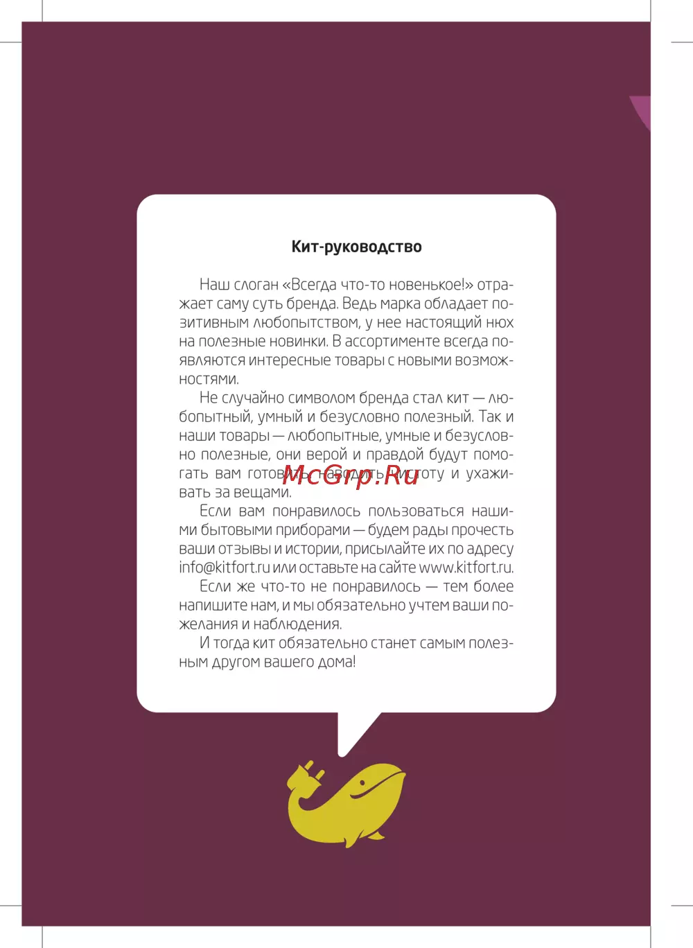 Кит руководство Наш слоган Всегда что то новенькое отра жает саму суть бренда Ведь марка обладает по зитивным любопытством у нее настоящий нюх на полезные новинки В ассортименте всегда по являются интересные товары с новыми возмож ностями Не случайно символом бренда стал кит лю бопытный умный и безусловно полезный Так и наши товары любопытные умные и безуслов но полезные они верой и правдой будут помо гать вам готовить наводить чистоту и ухажи вать за вещами Если вам понравилось пользоваться наши ми бытовыми приборами будем рады прочесть ваши отзывы и истории присылайте их по адресу info kitfort ru или оставьте на сайте www kitfort ru Если же что то не понравилось тем более напишите нам и мы обязательно учтем ваши по желания и наблюдения И тогда кит обязательно станет самым полез ным другом вашего дома