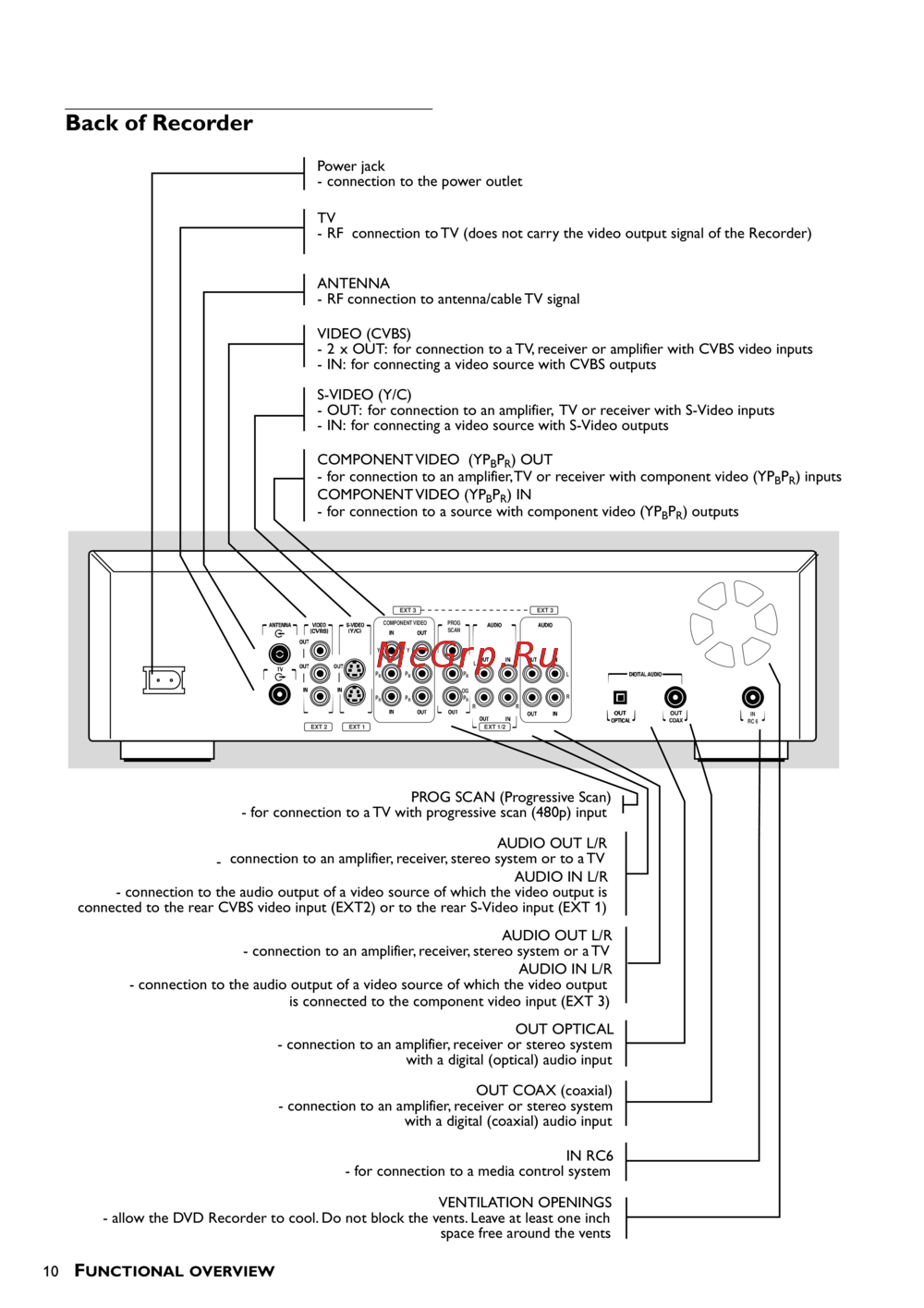 - RF connection to TV (does not carry the video output signal of the Recorder)