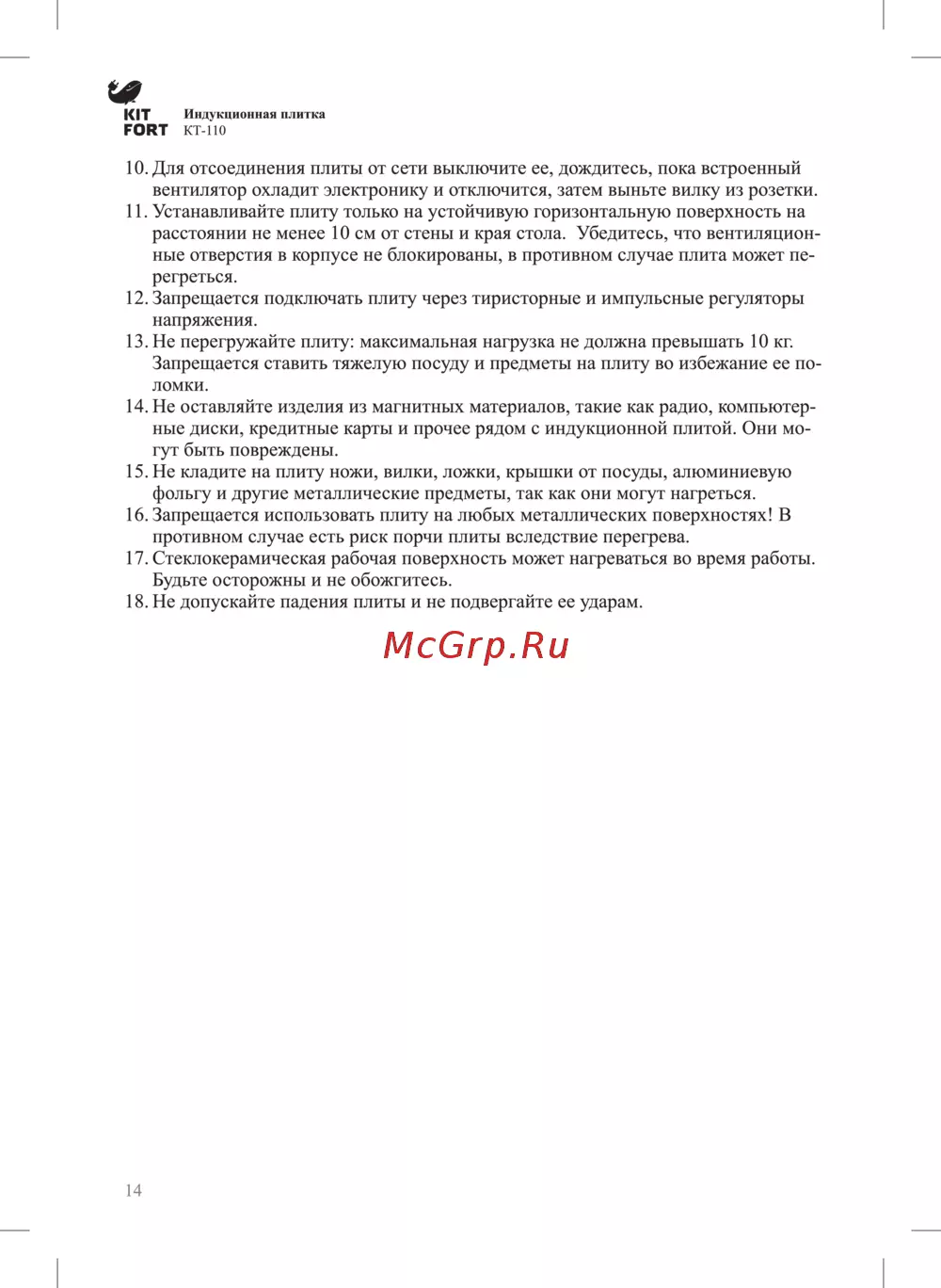 KIT Индукционная плитка FORT КТ 110 10 Для отсоединения плиты от сети выключите ее дождитесь пока встроенный вентилятор охладит электронику и отключится затем выньте вилку из розетки 11 Устанавливайте плиту только на устойчивую горизонтальную поверхность на расстоянии не менее 10 см от стены и края стола Убедитесь что вентиляцион ные отверстия в корпусе не блокированы в противном случае плита может пе регреться 12 Запрещается подключать плиту через тиристорные и импульсные регуляторы напряжения 13 Не перегружайте плиту максимальная нагрузка не должна превышать 10 кг Запрещается ставить тяжелую посуду и предметы на плиту во избежание ее по ломки 14 Не оставляйте изделия из магнитных материалов такие как радио компьютер ные диски кредитные карты и прочее рядом с индукционной плитой Они мо гут быть повреждены 15 Не кладите на плиту ножи вилки ложки крышки от посуды алюминиевую фольгу и другие металлические предметы так как они могут нагреться 16 Запрещается использовать плиту на любых металлических поверхностях В противном случае есть риск порчи плиты вследствие перегрева 17 Стеклокерамическая рабочая поверхность может нагреваться во время работы Будьте осторожны и не обожгитесь 18 Не допускайте падения плиты и не подвергайте ее ударам 14