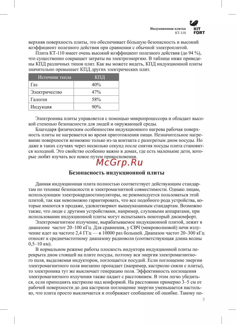Индукционная плитка КТ 110 KIT FORT верхняя поверхность плиты это обеспечивает большую безопасность и высокий коэффициент полезного действия при сравнении с обычной электроплитой Плита КТ 110 имеет очень высокий коэффициент полезного действия до 94 что существенно сокращает затраты на электроэнергию В таблице ниже приведе ны КПД различных типов плит Как вы можете видеть КПД индукционной плиты значительно превышает КПД других электрических плит Источник тепла КПД Газ 40 Электричество 47 Галоген 58 Индукция 90 Электроника плиты управляется с помощью микропроцессора и обладает высо кой степенью безопасности для людей и окружающей среды Благодаря физическим особенностям индукционного нагрева рабочая поверх ность плиты не нагревается во время приготовления пищи Незначительное нагре вание поверхности возможно только из за контакта с разогретым дном посуды Но даже в таких случаях через несколько секунд после снятия посуды плита становит ся холодной Это свойство особенно важно в домах где есть маленькие дети кото рые любят изучать все новое путем прикосновения Безопасность индукционной плиты Данная индукционная плита полностью соответствует действующим стандар там по технике безопасности и электромагнитной совместимости Однако лицам использующим электрокардиостимуляторы не рекомендуется пользоваться этой плитой так как невозможно гарантировать что все подобного рода устройства ко торые имеются в продаже удовлетворяют вышеуказанным стандартам Возможно также что люди с другими устройствами например слуховыми аппаратами при использовании индукционной плиты могут испытывать некоторый дискомфорт Электромагнитное излучение вырабатываемое индукционной плитой лежит в диапазоне частот 20 100 кГц Для сравнения у СВЧ микроволновой печи излу чение идет на частоте 2 4 ГГц в 10000 раз большей Диапазон частот 20 300 кГц относят к среднечастотному диапазону радиоволн соответствующая длина волны 0 5 10 км В нормальном режиме работы плоскость индуктора индукционной плиты пе рекрыта дном стоящей на плите посуды поэтому вся энергия электромагнитно го поля выделяемая индуктором поглощается посудой Если поглощение энергии электромагнитного поля внезапно пропадает например кастрюлю сняли с плиты то электроника тут же выключает генерацию поля Эффективность поглощения электромагнитного излучения также падает с расстоянием В этом легко убедить ся если приподнять кастрюлю над конфоркой На расстоянии примерно 3 5 см от рабочей поверхности до дна кастрюли поглощение энергии уменьшается настоль ко что плита просто выключается и отображает сообщение об ошибке Такому по