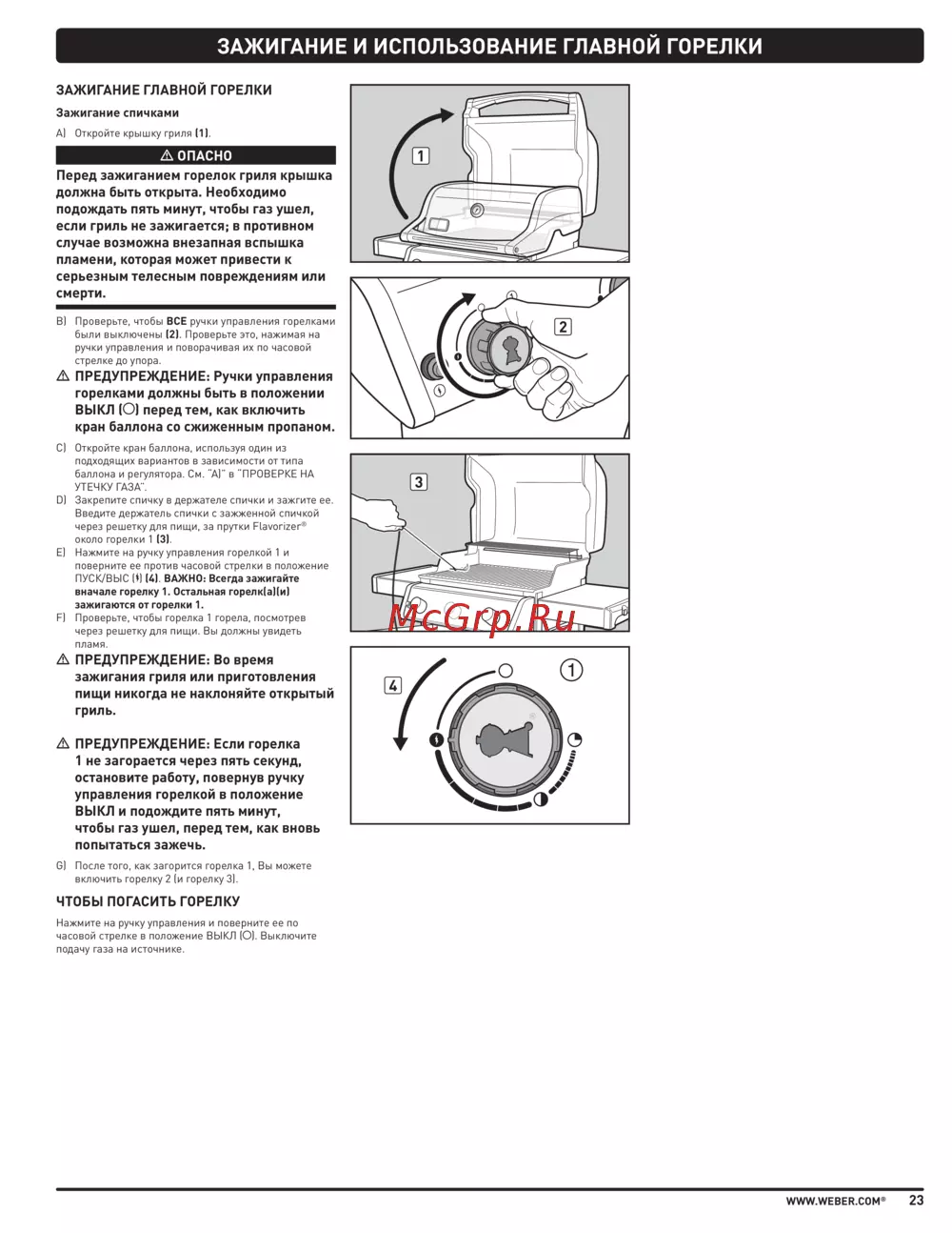 Weber Spirit E-210 Original, черный (46010675) — инструкция по зажиганию и использованию главной горелки гриля [23/36]