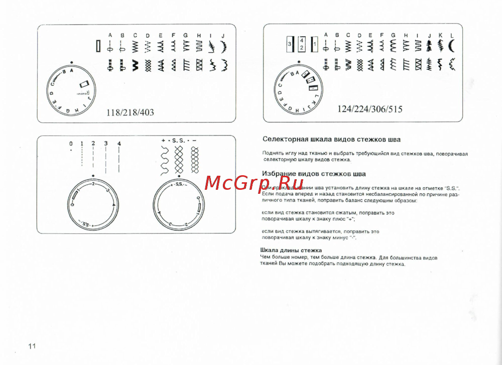 Селекторная шкала видов стежков шва Поднять иглу над тканью и выбрать требующийся вид стежков шва поворачивая селекторную шкалу видоа стежка Избрание видов стежков шва При прокладывании шва установить длину стежка на шкале на отметке 3 3 Если подача вперед и назад становится несбалансированной по причине раз личного типа тканей поправить баланс следующим образом если вид стежка становится сжатым поправить это поворачивая шкалу к знаку плюс если вид стежка вытягивается поправить это поворачивая шкалу к знаку минус Шкала длины стежка Чем больше номер тем больше длина стежка Для большинства видов тканей бы може е подобрать подходящую длину стежка 11
